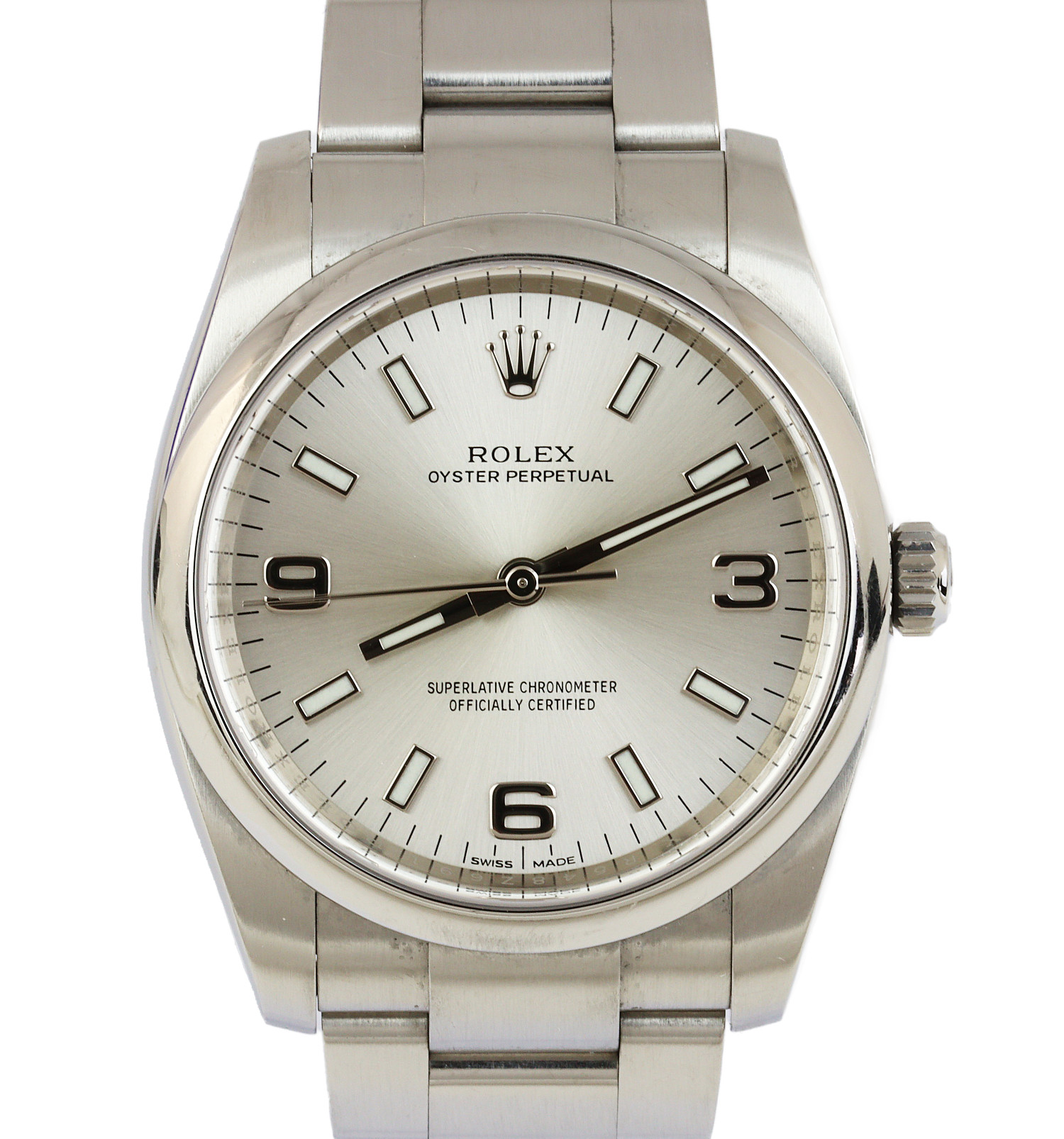Rolex men’s stainless steel Oyster Perpetual 114200 wristwatch. Made circa 2002. No documents are included.