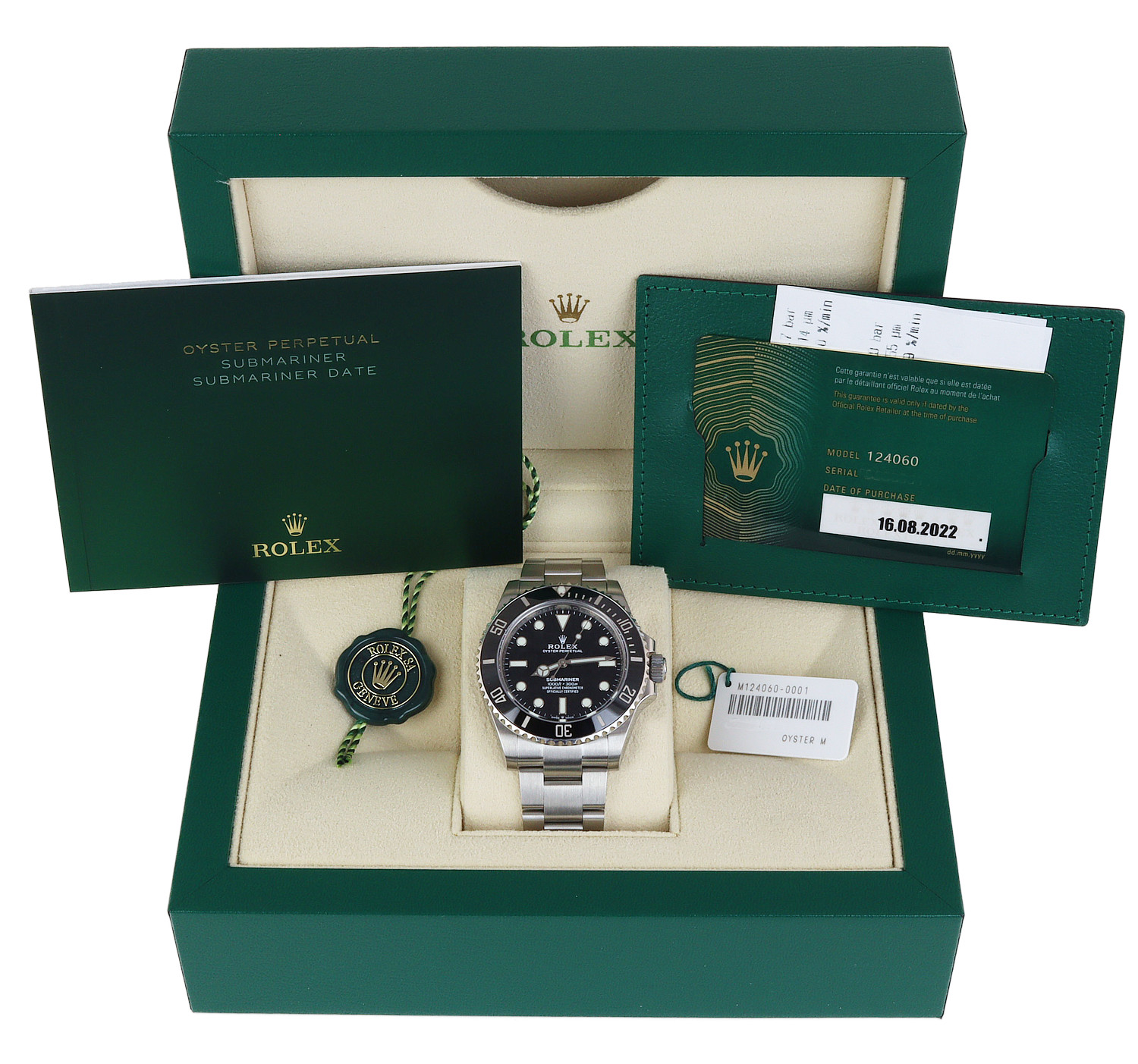 Rolex men’s stainless steel Submariner 124060 wristwatch. Made circa 2022. Documents are included in the sale.