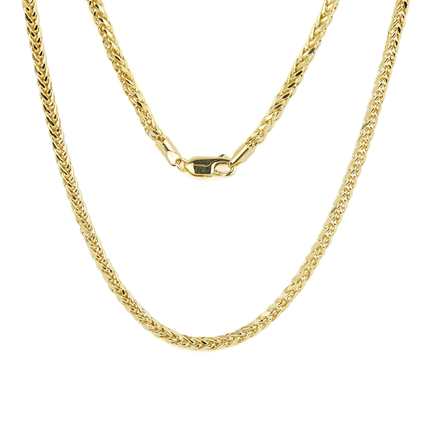 14k yellow gold unisex wide wheat chain. Measures 20″ long, 3mm wide, has a lobster clasp, and weighs 7.3 grams.