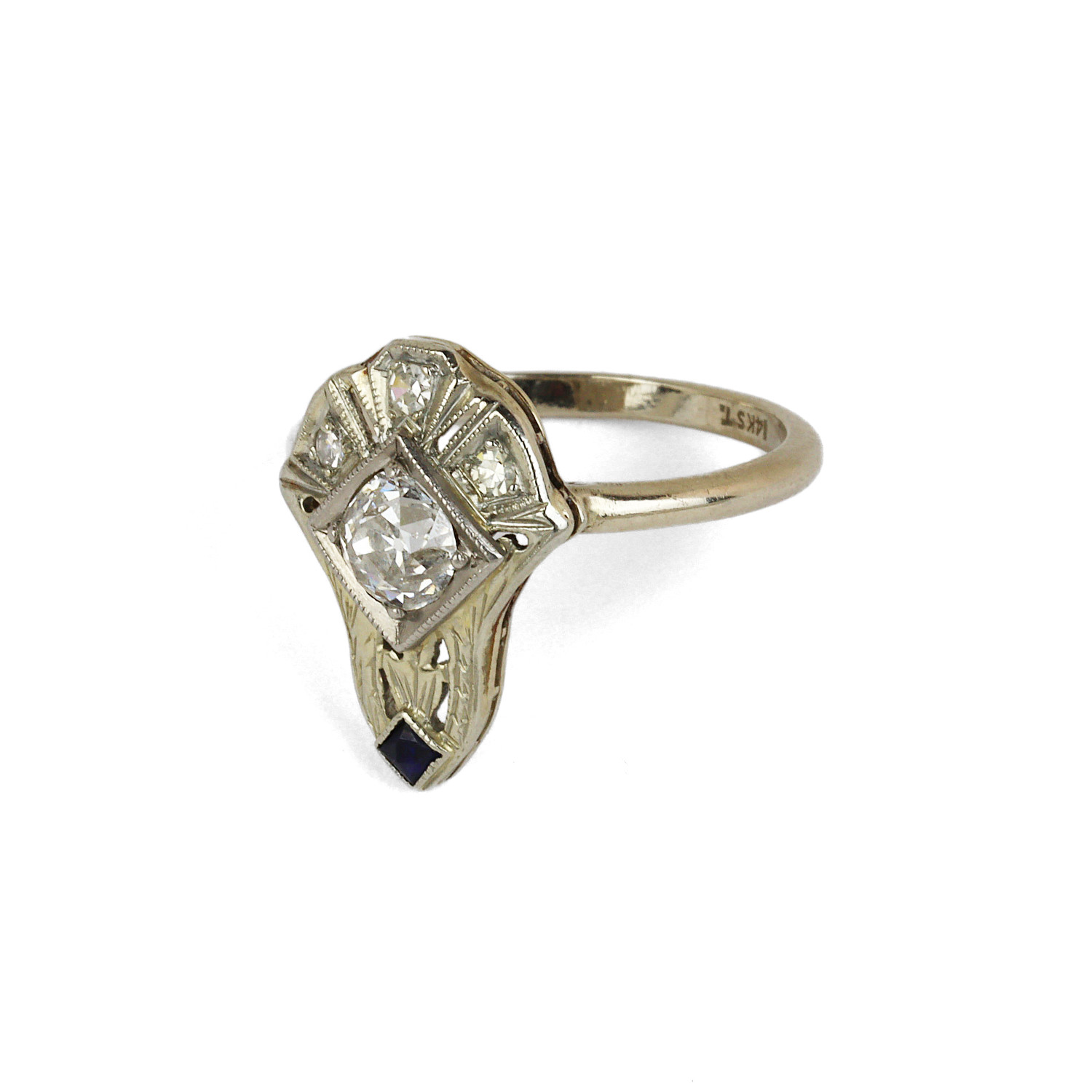 Vintage 14k white gold ring with diamonds which amount to approximately 0.60 carat TW (I1 clarity/F-G-H color) and a 2mm synthetic sapphire. Fits a size 5.5 finger, measures 17mm wide across the top, and weighs 2.7 grams.