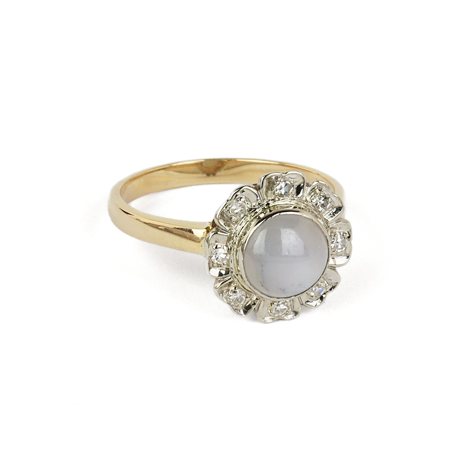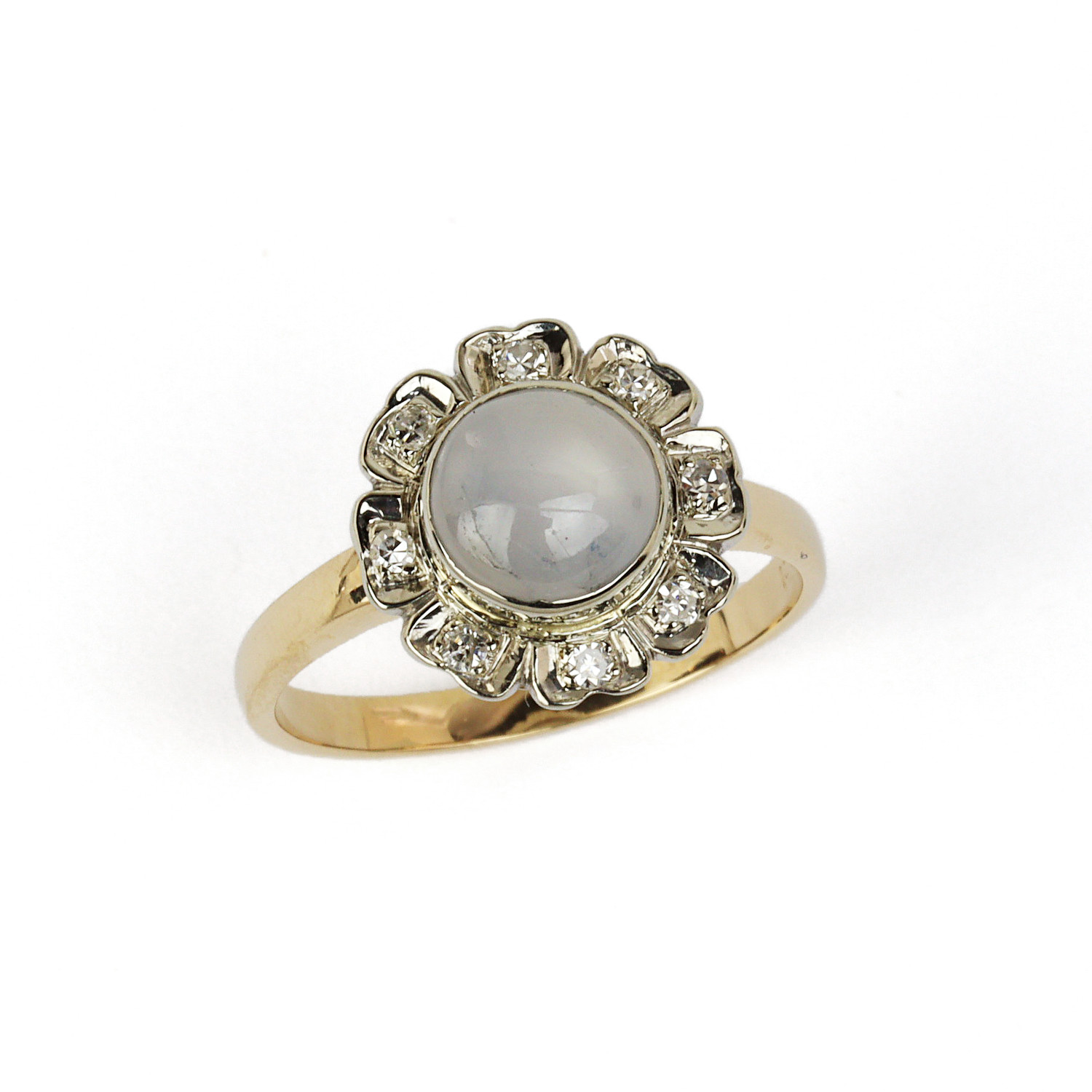 Vintage 14k yellow & white gold ring with an 8mm white star sapphire stone and diamonds which amount to approximately 0.15 carat TW (SI1-I2 clarity/G-H-I color). Fits a size 7 finger, measures 13mm wide across the top, and weighs 3.4 grams.
