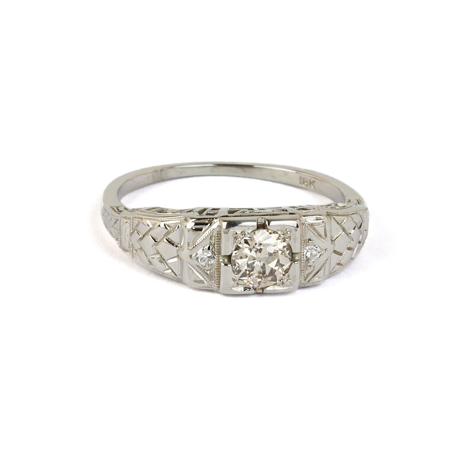 Vintage 18k white gold ring with diamonds which amount to approximately 0.35 carat TW (I1 clarity/light brown color). Fits a size 6.75 finger, measures 6mm wide across the top, and weighs 2.4 grams.