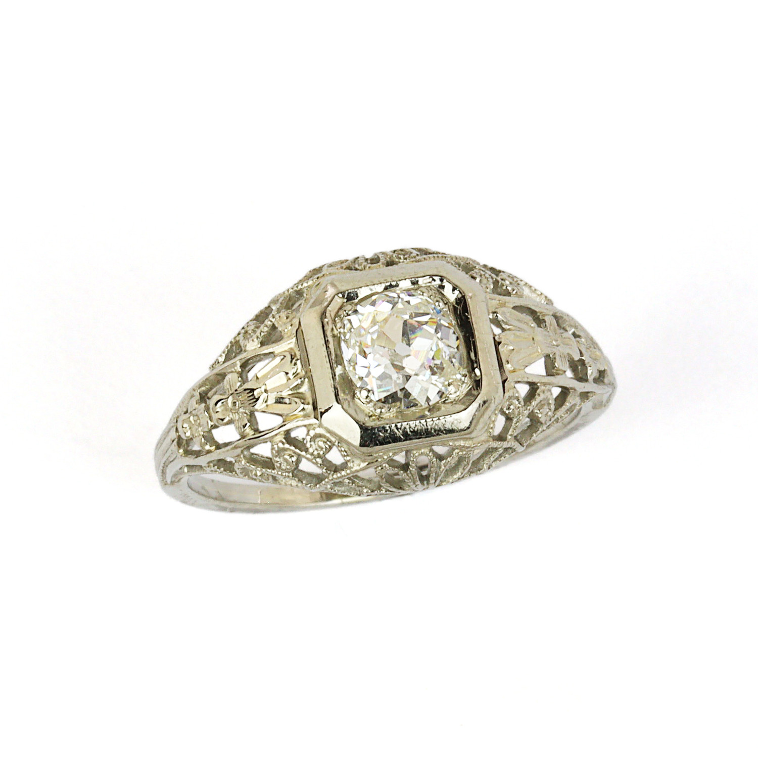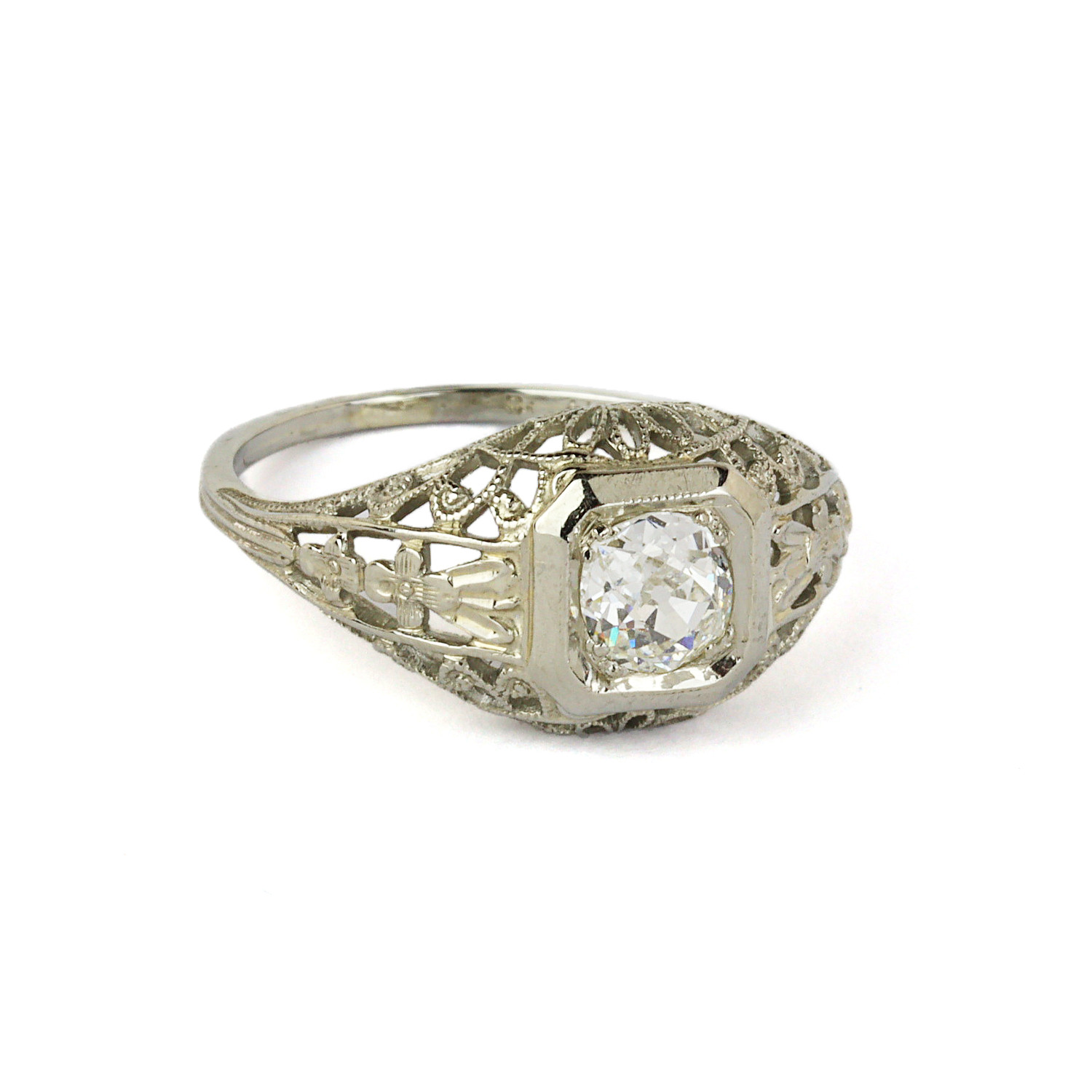 Vintage 18k white gold ring with a 0.40 carat diamond (SI1 clarity/G-H-I color). Fits a size 6 finger, measures 10mm wide across the top, and weighs 2.3 grams.