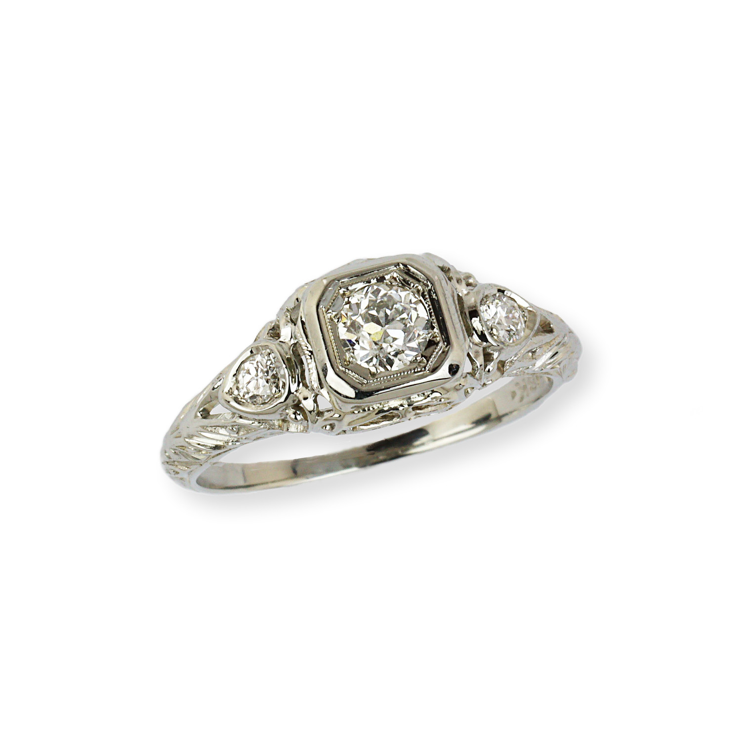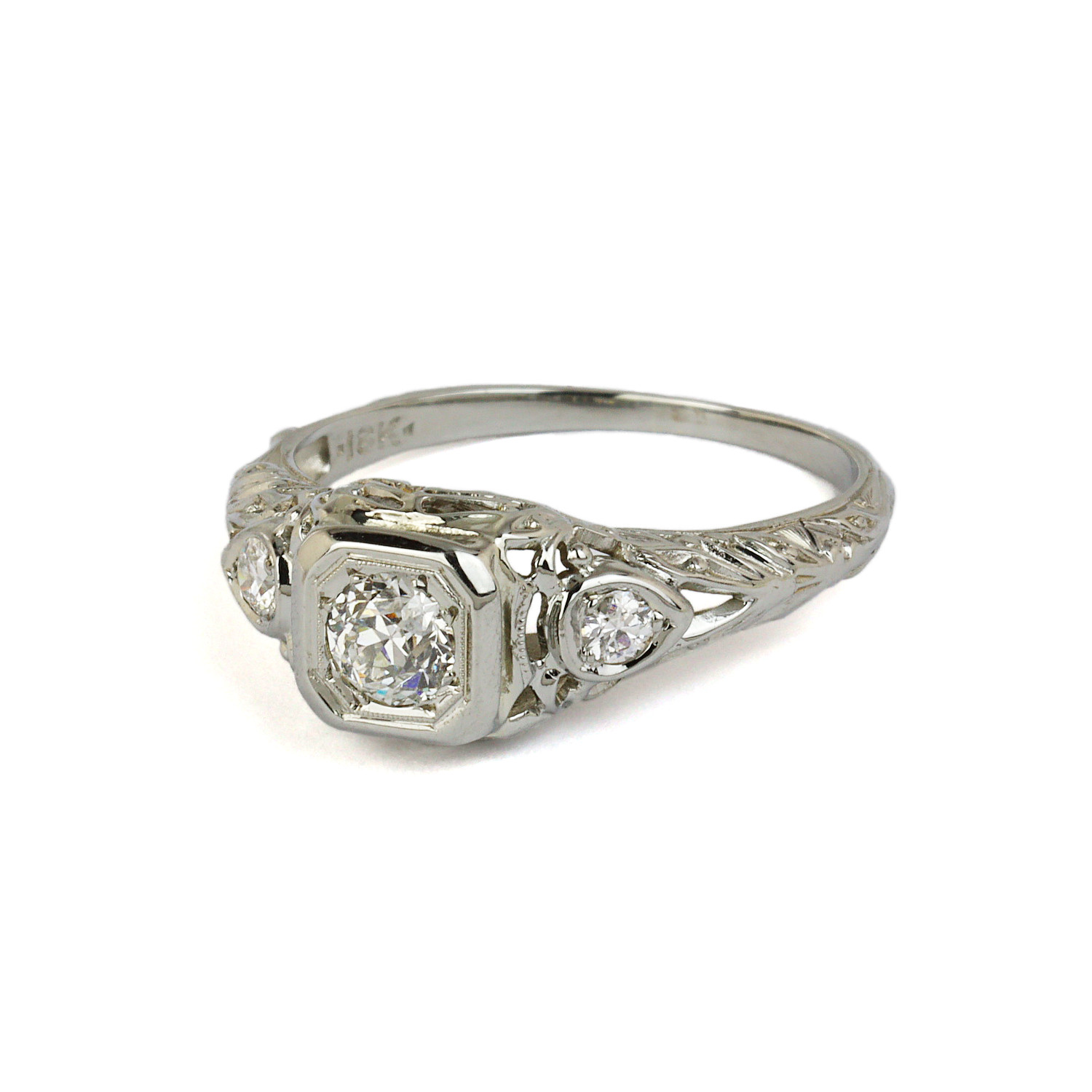 Vintage 18k white gold ring with a 0.30 carat old European cut center diamond (VS2 clarity/F-G-H color) and side diamonds which amount to approximately 0.10 carat TW (VS2-SI2 clarity/G-H color). Fits a size 6.25 finger, measures 8mm wide across the top, and weighs 3.2 grams.