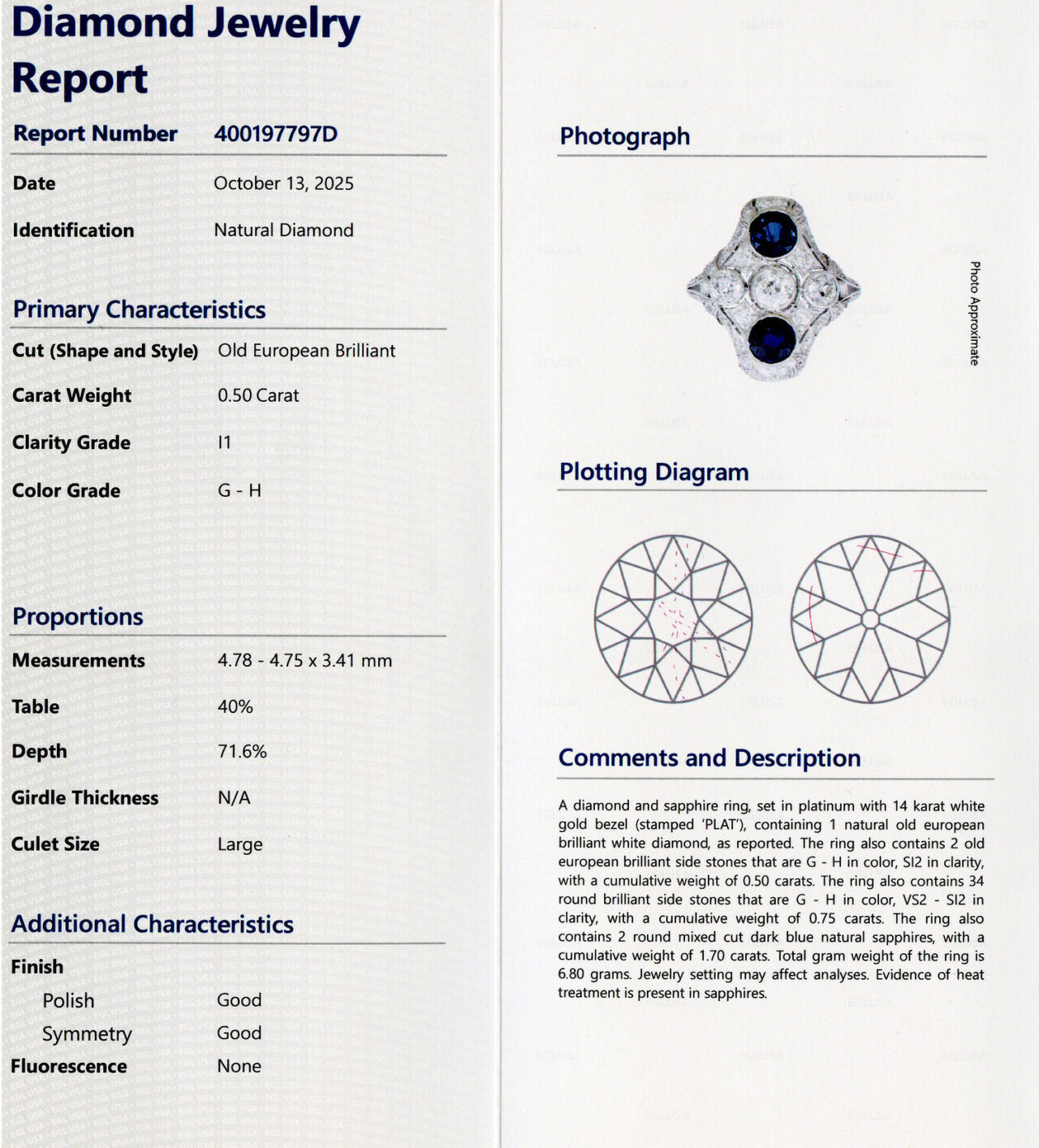 Vintage platinum ring with a 14k white gold bezel. This ring features 1 0.50 carat (I1 clarity/G-H color) old European brilliant cut diamond, 2 old European brilliant cut side diamonds which amount to approximately 0.50 carat TW (SI2 clarity/G-H color), and 34 round brilliant cut diamonds on the sides which amount to approximately 0.75 carat TW (VS2-SI2 clarity/G-H color). The 2 mixed cut dark blue sapphire stones amount to approximately 1.70 carat TW. Fits a size 8.75 finger, measures 24mm wide across the top, and weighs 6.8 grams. Evidence of heat treatment is present in the sapphire stones.