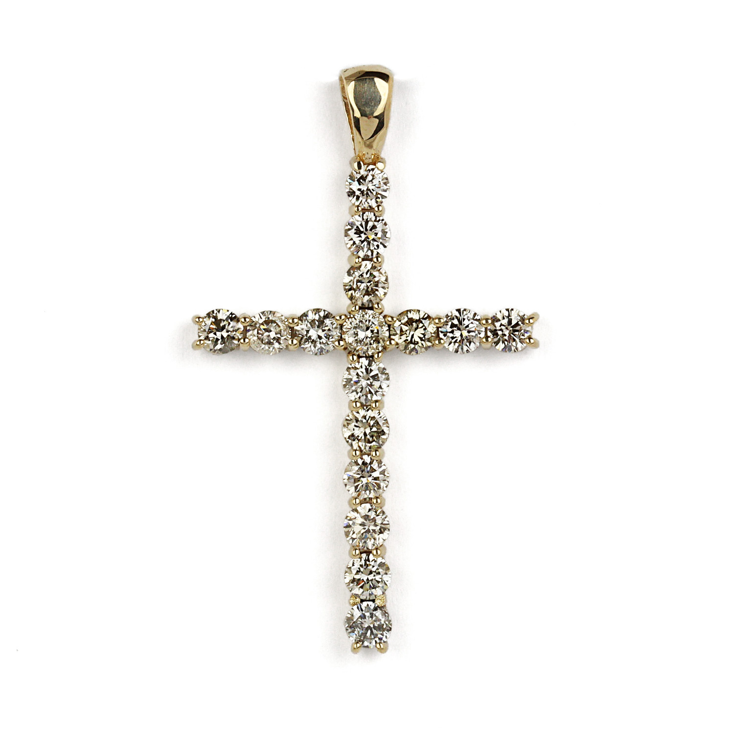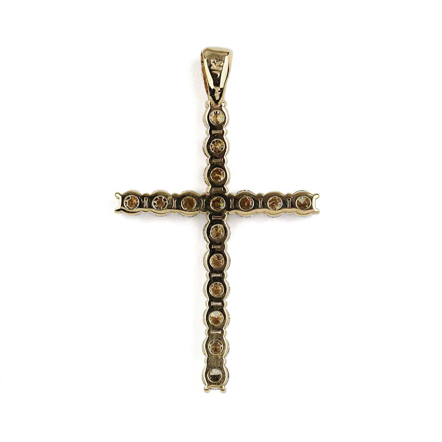 10k yellow gold cross pendant containing diamonds which amount to approximately 1.75 carat TW (I1 clarity/champagne color). It measures 39mm tall, 23mm wide, the bail fits a size 2mm chain, and weighs 2.3 grams. This does not have a purity stamp, but has been non-invasively tested as 10k gold.