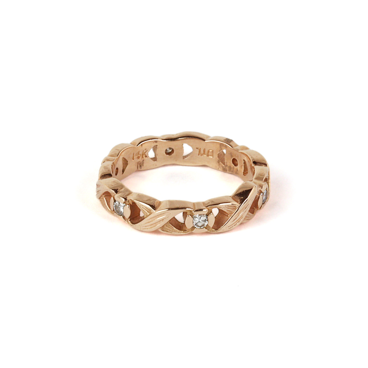 14k rose gold ring with diamonds which amount to approximately 0.21 carat TW (I1 clarity/G-H-I color). Fits a size 5.25 finger, measures 4mm wide across the top, and weighs 3.9 grams.