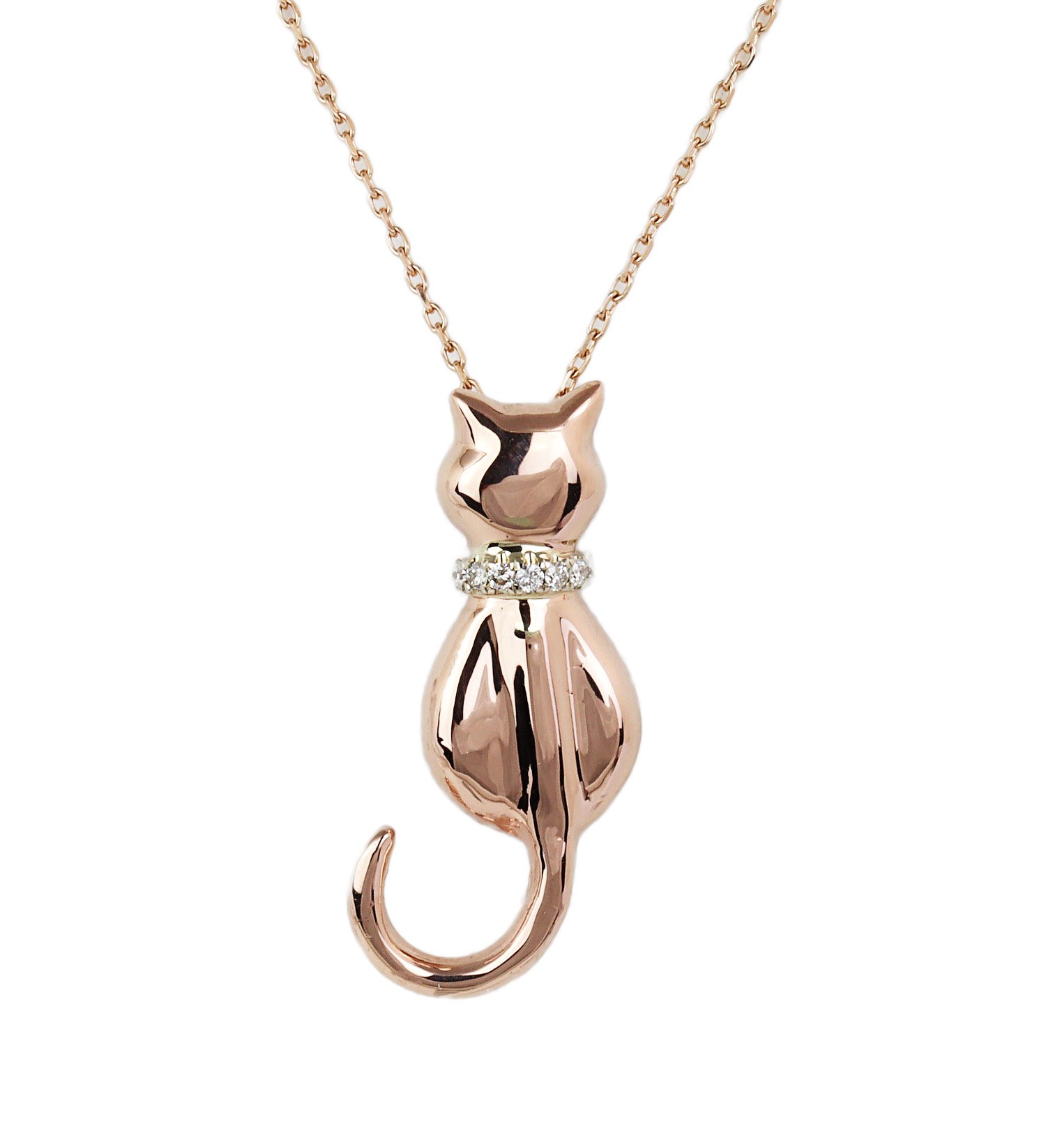 14k rose gold necklace featuring a cat pendant containing diamonds which amount to approximately 0.05 carat TW (SI1-SI2 clarity/H-I-J color). The pendant measures 27mm tall, 9mm at the widest, the chain is 18″ long, and total weight is 3.6 grams.