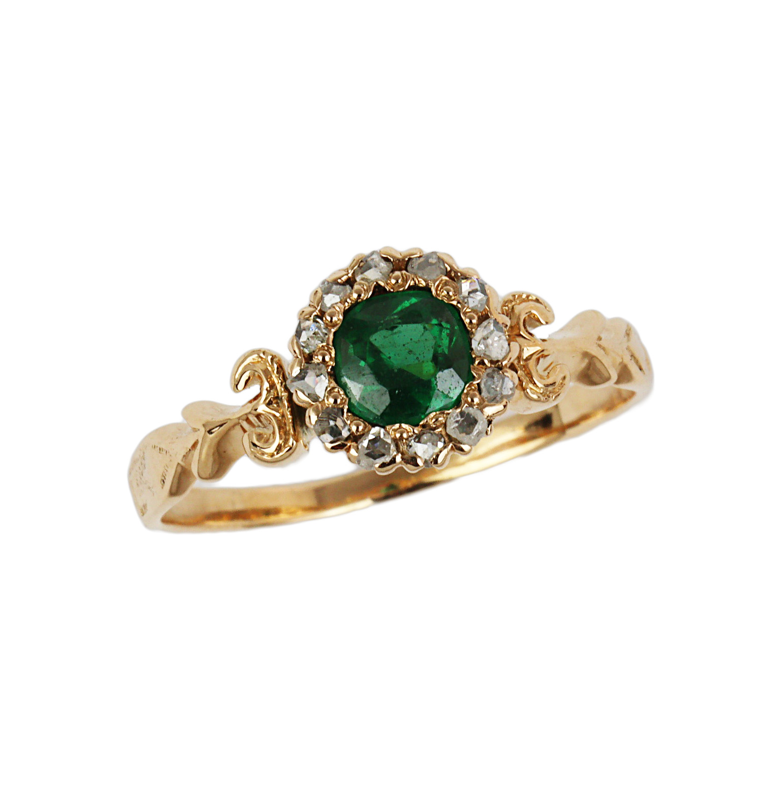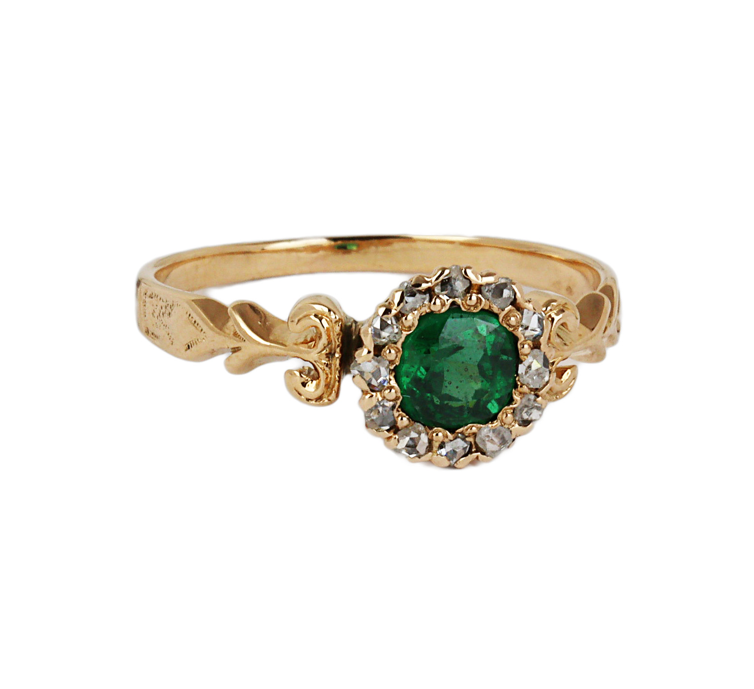 14k yellow gold vintage ring with a 5mm glass and garnet doublet stone and rose cut diamonds which amount to approximately 0.06 carat TW. Fits a size 7.75 finger, measures 8mm wide across the top, and weighs 3.0 grams.