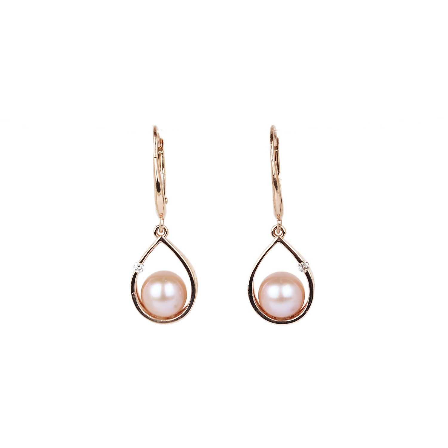 14k rose gold featuring 7mm pink pearls and diamonds which amount to approximately 0.04 carat TW (I1 clarity/J-K-L color). They measure 29mm tall, 10mm at the widest, and weigh 3.9 grams total.
