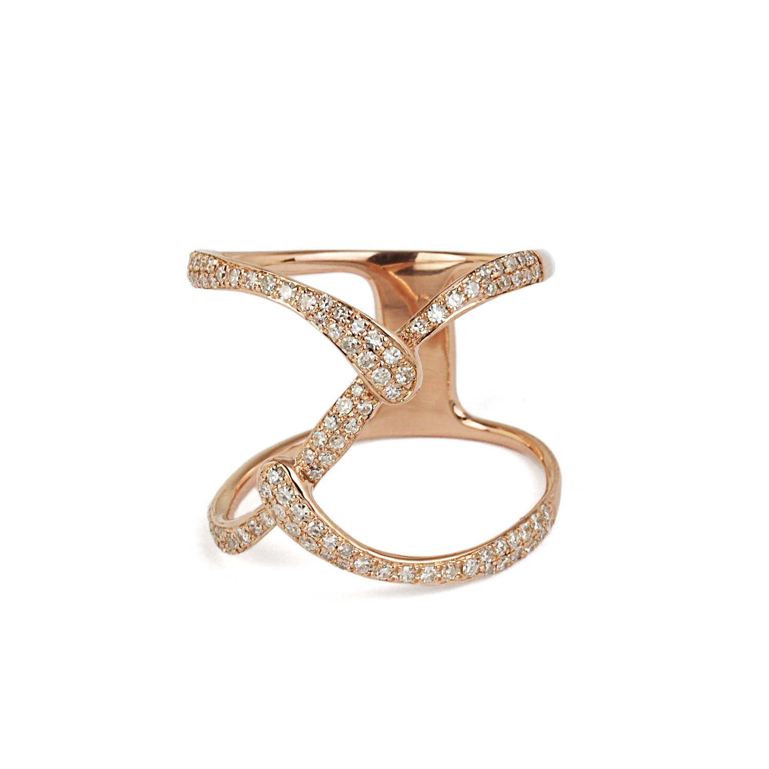 14k rose gold ring with diamonds which amount to approximately 0.32 carat TW (SI2-I1 clarity/H-I-J color). Fits a size 7 finger, measures 18mm wide across the top, and weighs 3.8 grams.