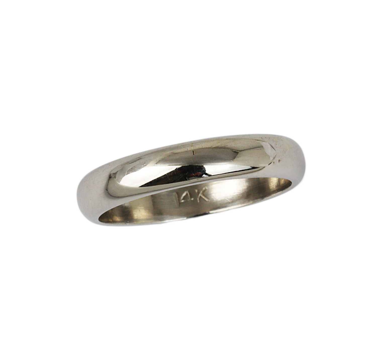 14k white gold ring. It measures 3.5mm wide, fits a size 5 finger, and weighs 2.8 grams.