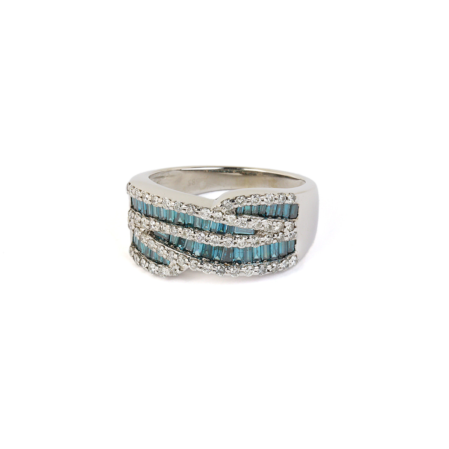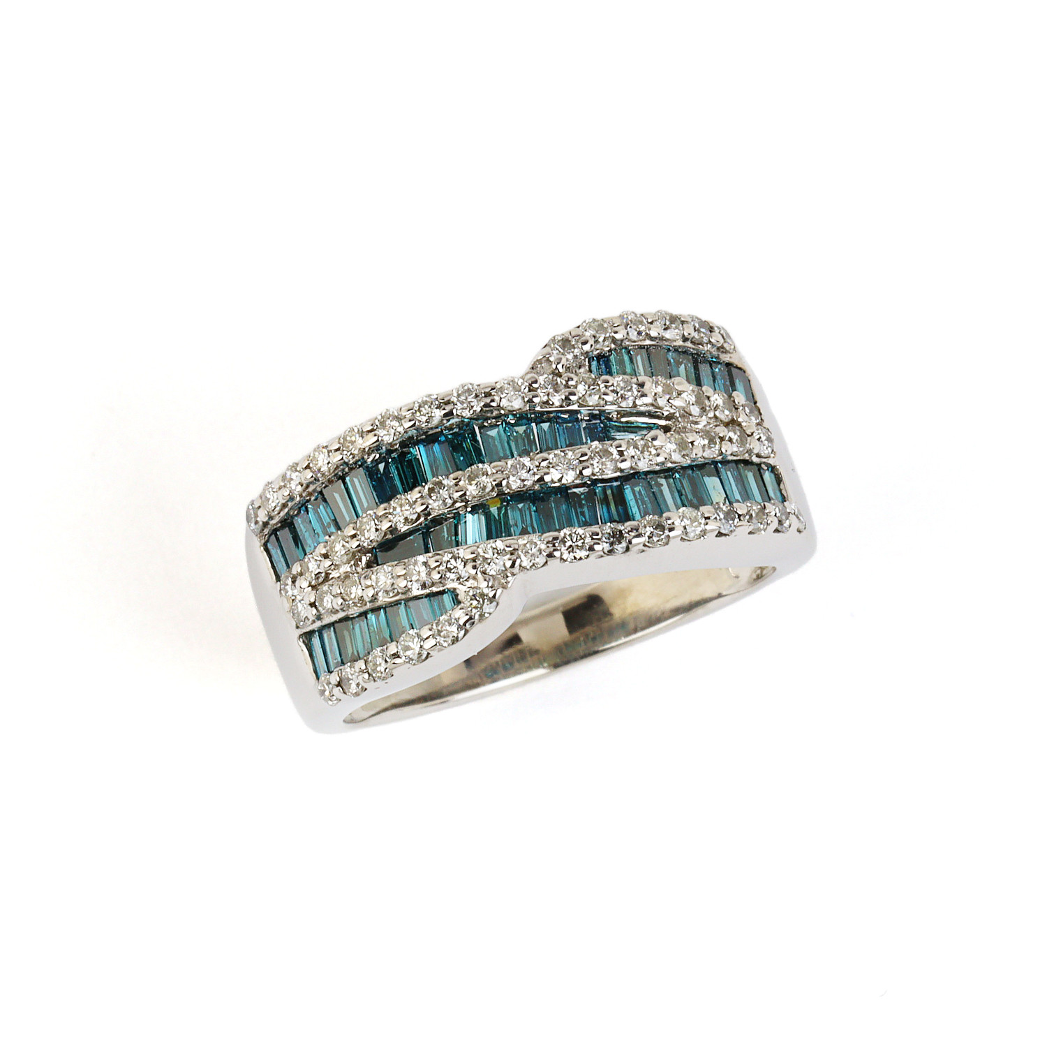 14k white gold ring with blue and clear diamonds which amount to approximately 1.50 carat TW (SI1-I1 clarity/G-H & blue color). Fits a size 7.5 finger, measures 12mm wide across the top, and weighs 6.0 grams.