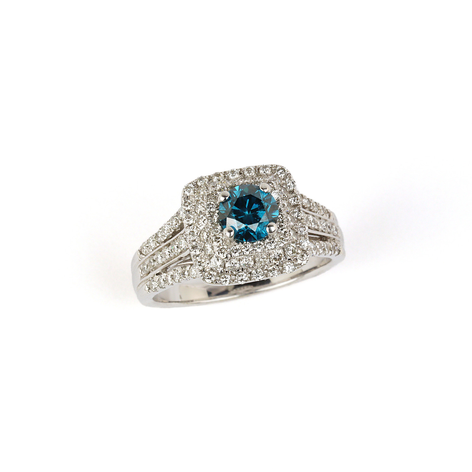 14k white gold ring with a 0.72 carat blue diamond (I1 clarity) in the center and accent diamonds which amount to approximately 1.07 carat TW. Fits a size 7 finger, measures 11mm wide across the top, and weighs 6.6 grams.