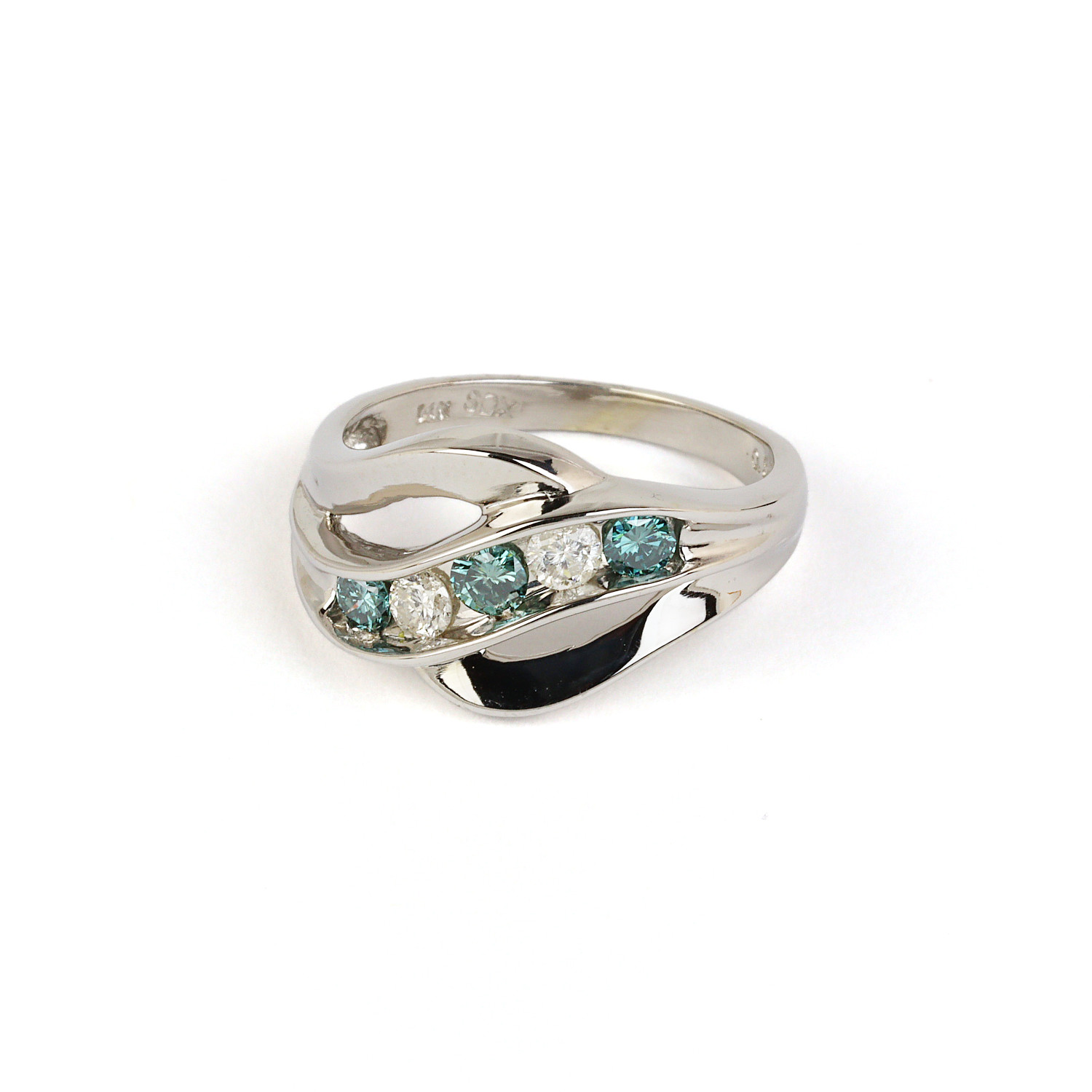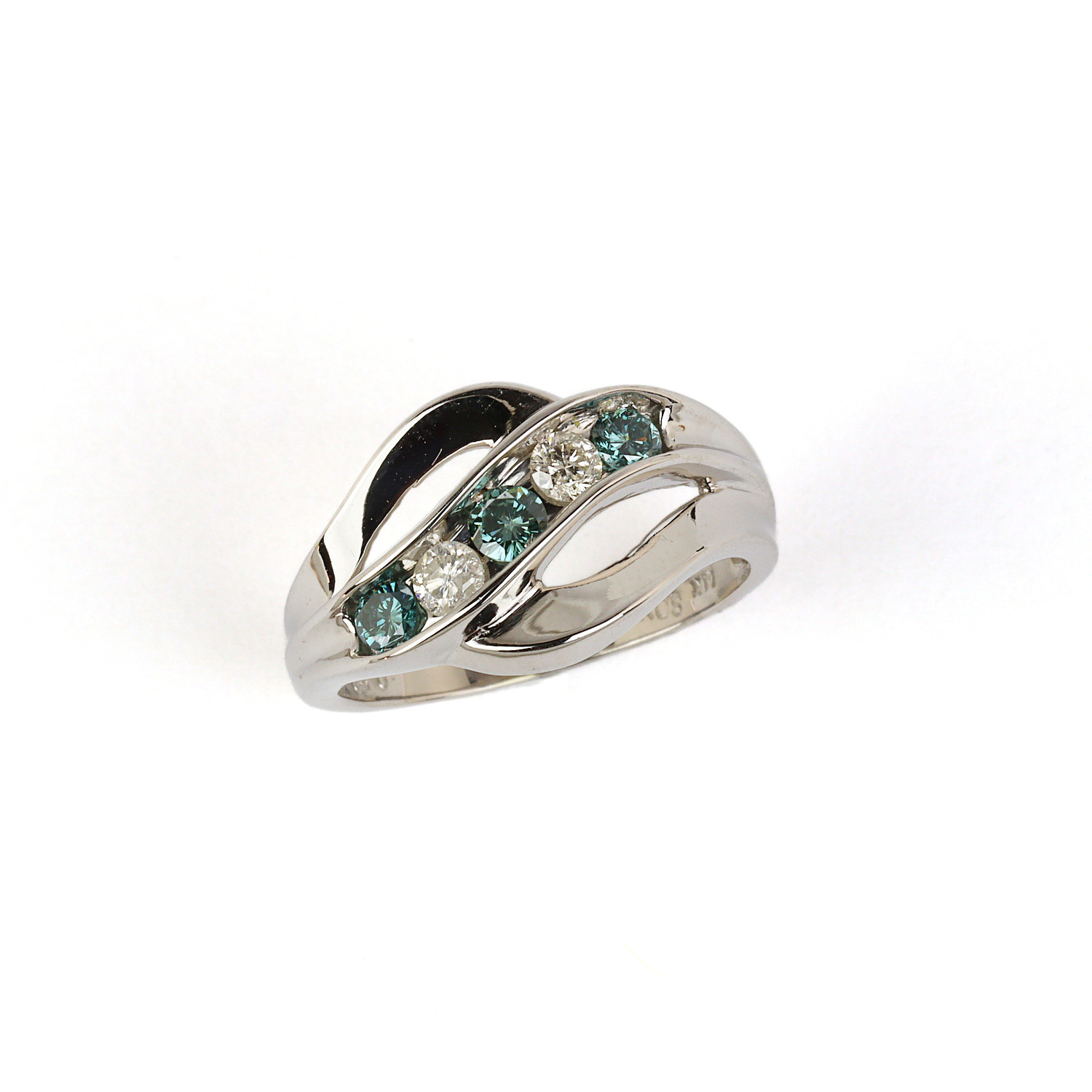 14k white gold ring with blue and white diamonds which amount to approximately 0.50 carat TW (SI2-I1 clarity/H-I-J color). Fits a size 6.75 finger, measures 12mm wide across the top, and weighs 3.9 grams.