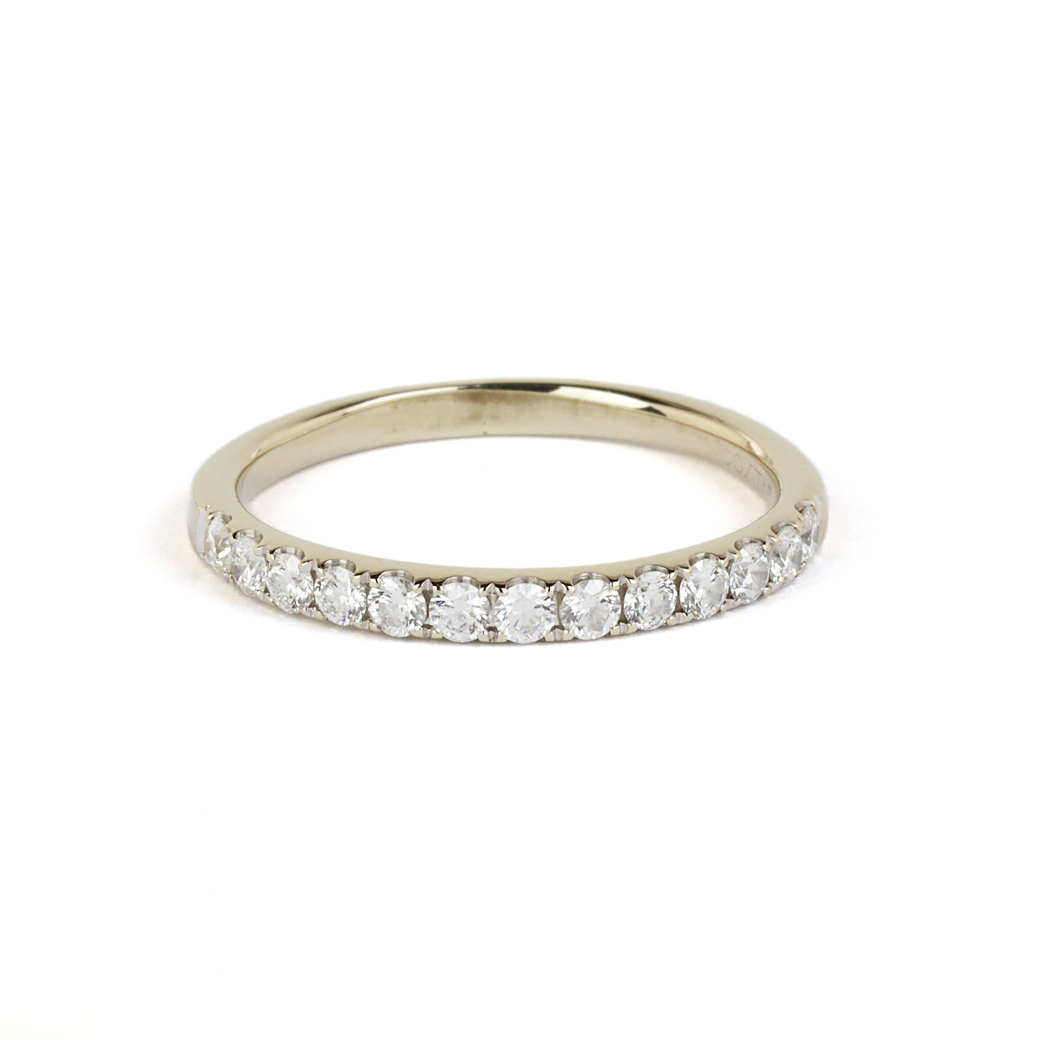 14k white gold ring with diamonds which amount to approximately 0.33 carat TW (SI2-I1 clarity/H-I color). Fits a size 5.25 finger, measures 2mm wide, and weighs 1.6 grams.