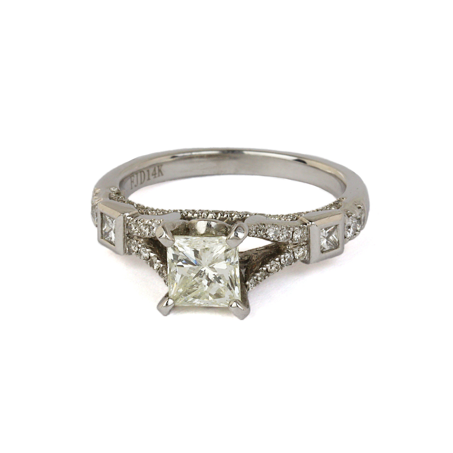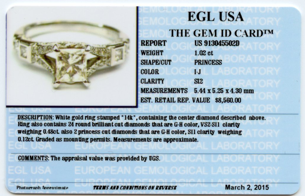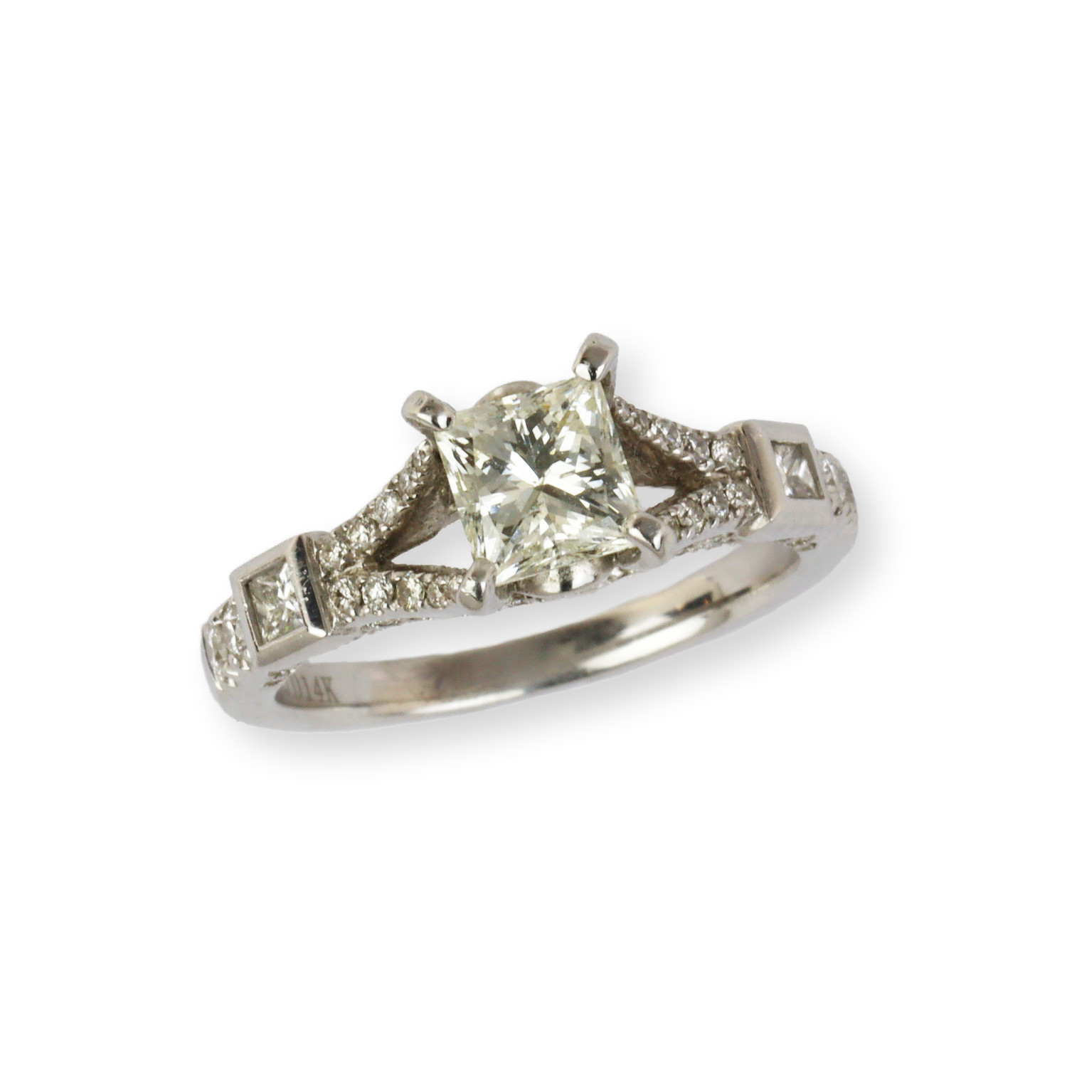 14k white gold ring with a 1.02 carat princess cut center diamond (SI2 clarity/I-J color) and diamond accents which amount to approximately 0.48 carat TW (VS2-SI1 clarity/G-H color). There are two princess cut diamonds on the shoulders which amount to approximately 0.12 carat TW (SI1 clarity/G-H color). Measures 7mm wide across the top, fits a size 6 finger, and weighs 4.1 grams. EGL cert # 913045502D is included in the sale.