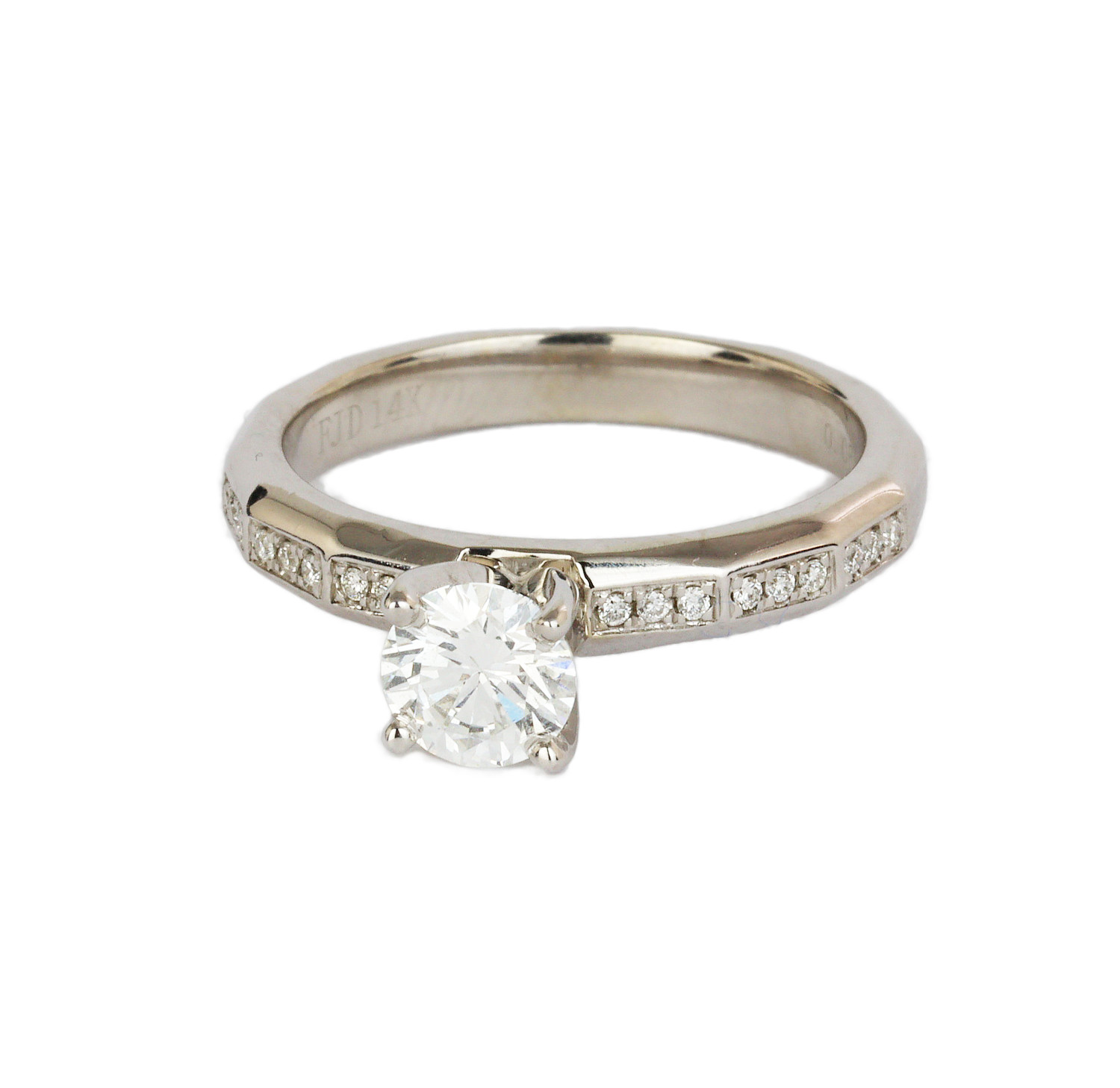 14k white gold ring with an EGL certified 0.71 carat “ideal plus hearts and arrows” cut diamond (SI2 clarity/D color). The accent diamonds amount to 0.086 carat, for a total carat weight of approximately 0.80 TDW. Measures 6mm wide across the top, fits a size 7 finger, and weighs 4.4 grams.