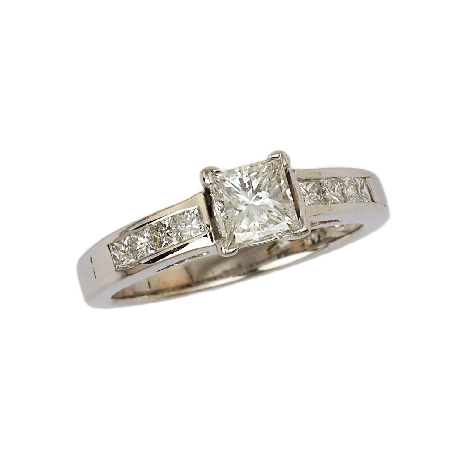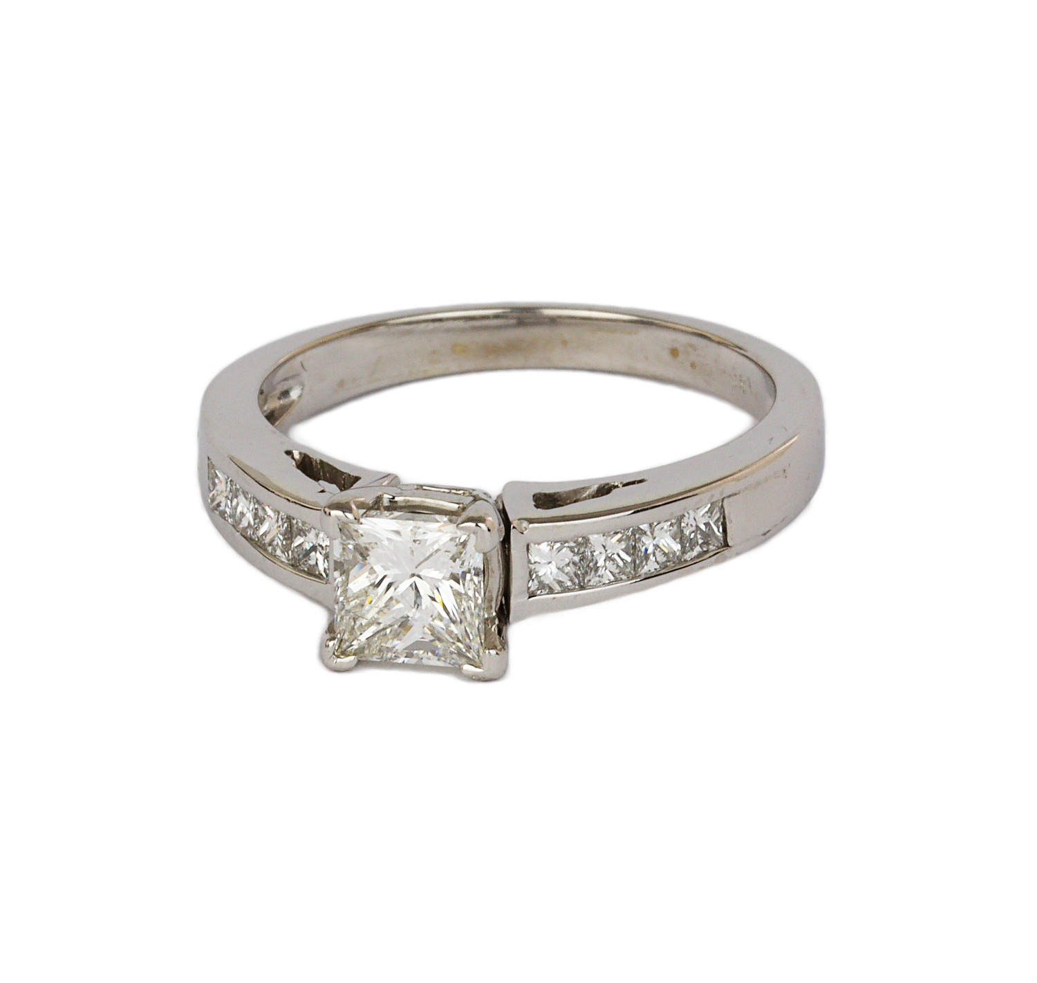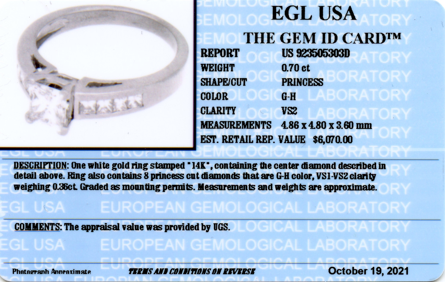 14k white gold ring with 0.70 carat princess cut center diamond (VS2 clarity/G-H color), the 8 princess cut accent diamonds amount to approximately 0.36 carat TW (VS1-VS2 clarity/G-H color) making the total carat weight being 1.06. Measures 6mm wide across the top, fits a size 5.75 finger, and weighs 3.2 grams.