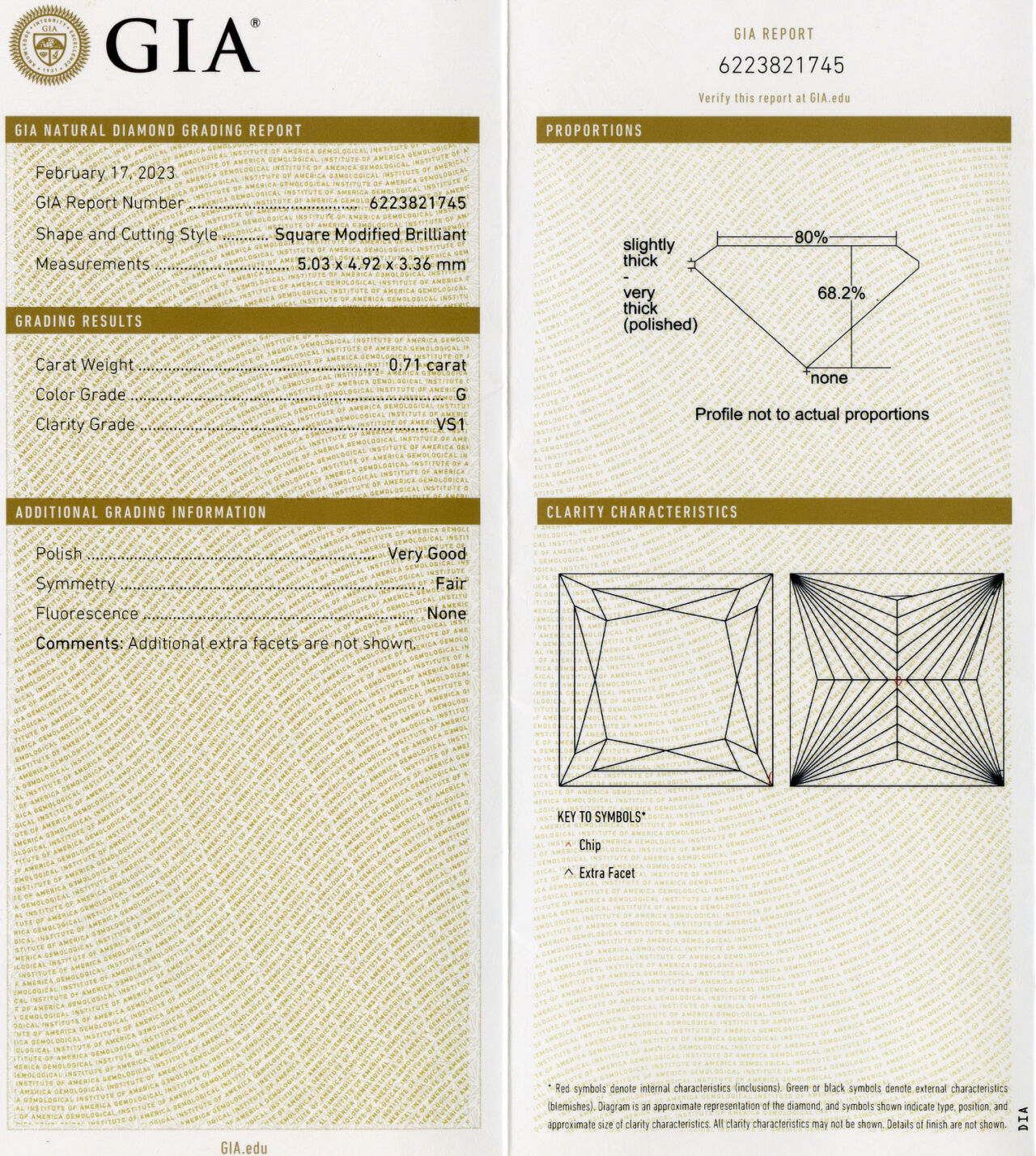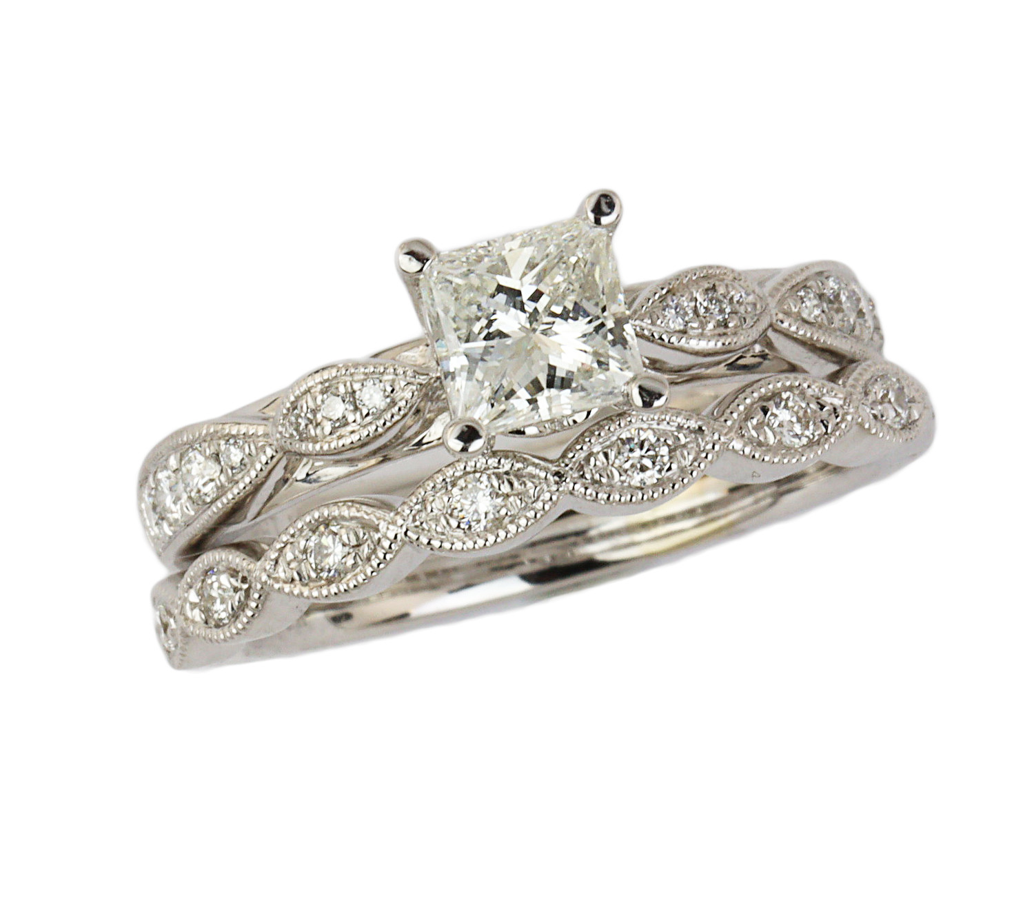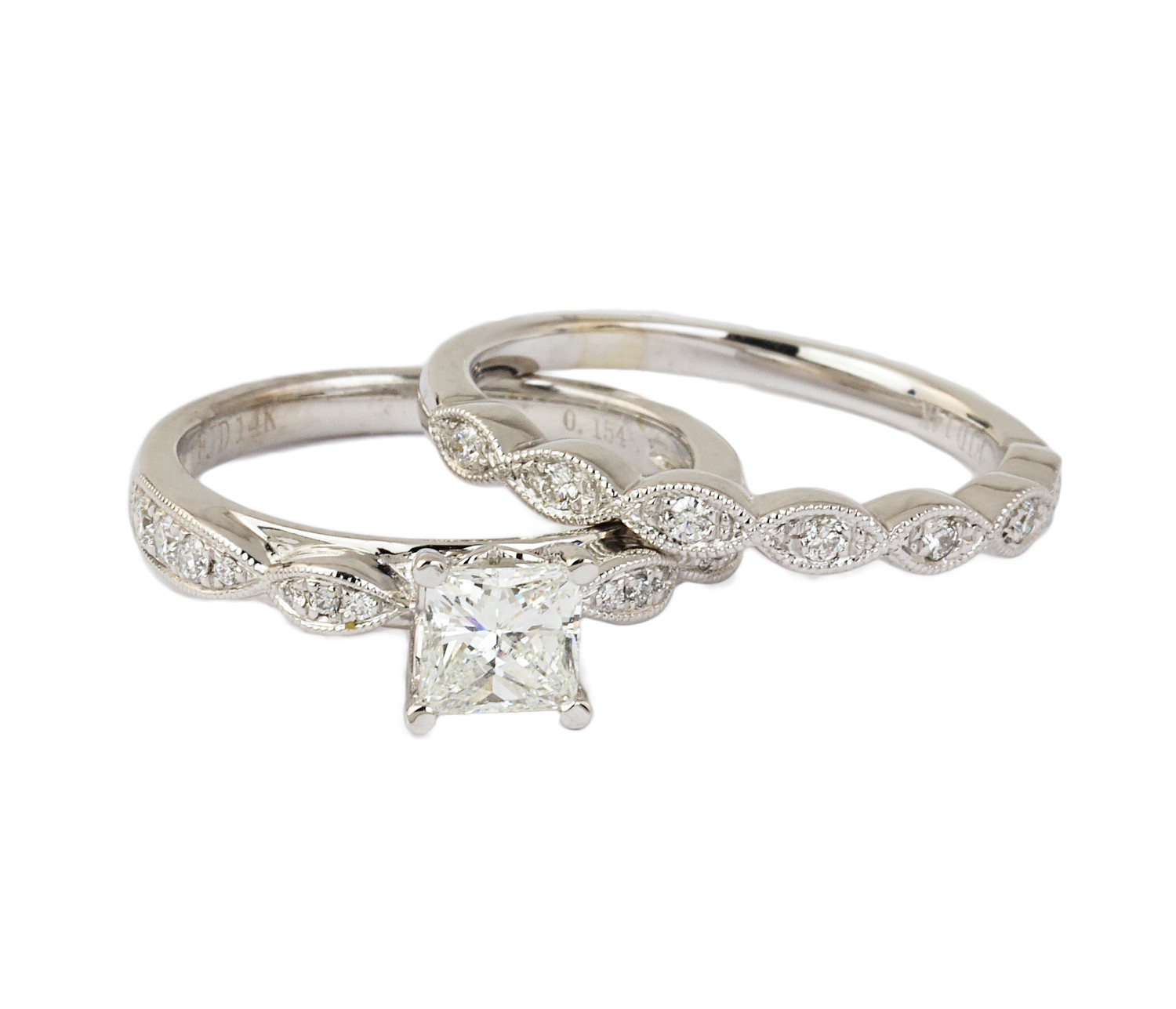 14K white gold wedding set with a 0.71 carat square modified brilliant cut center diamond (VS1 clarity/G color), fits a size 6 finger, and weighs 5.56 grams. GIA cert # 6223821745 is included in the sale.