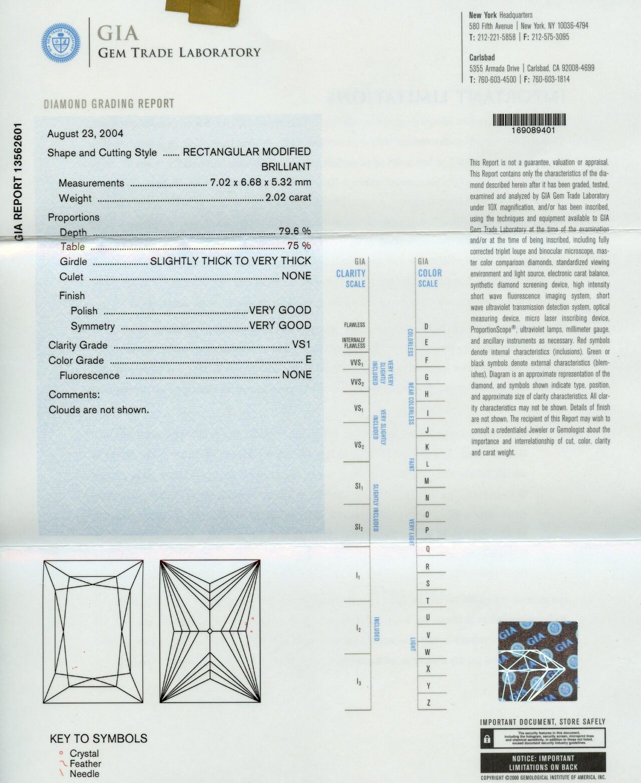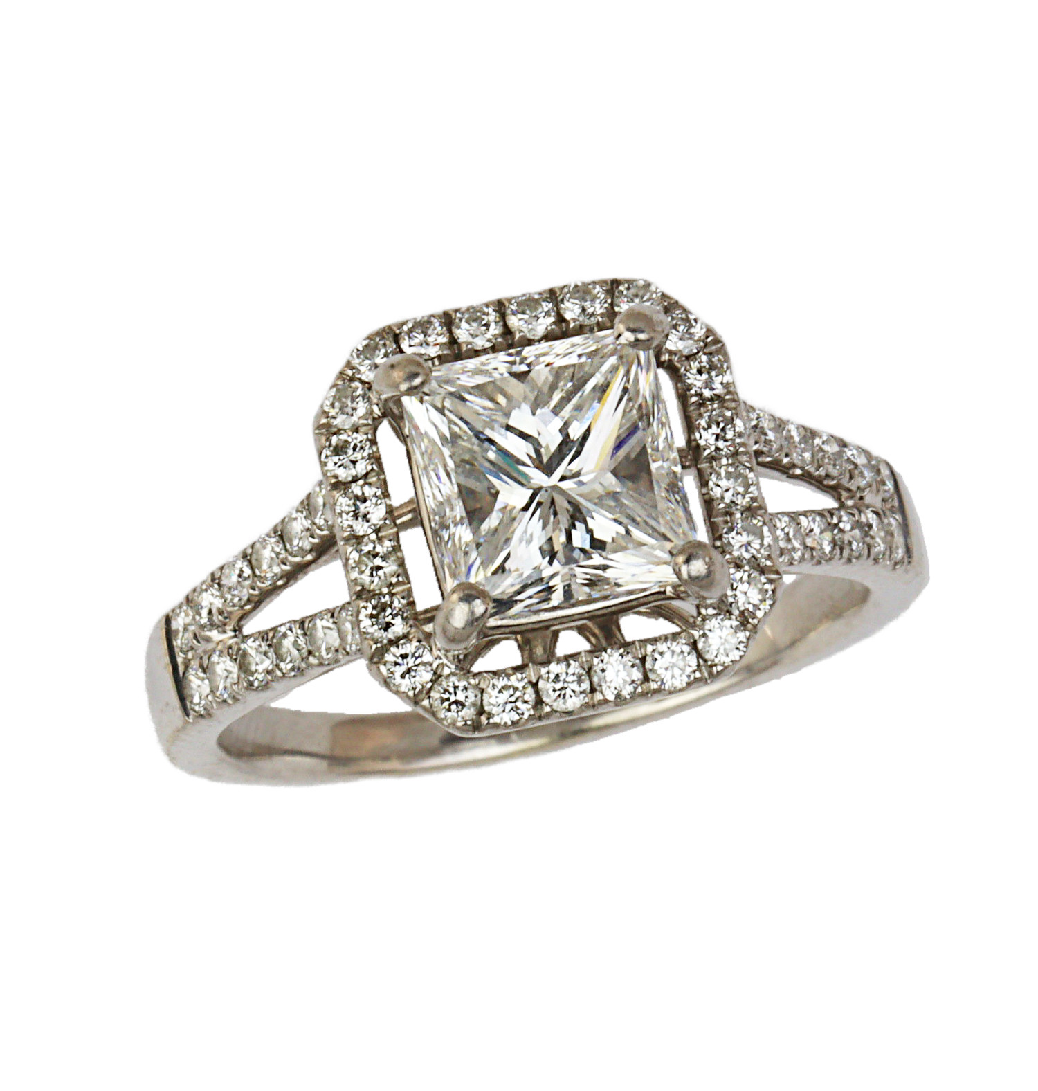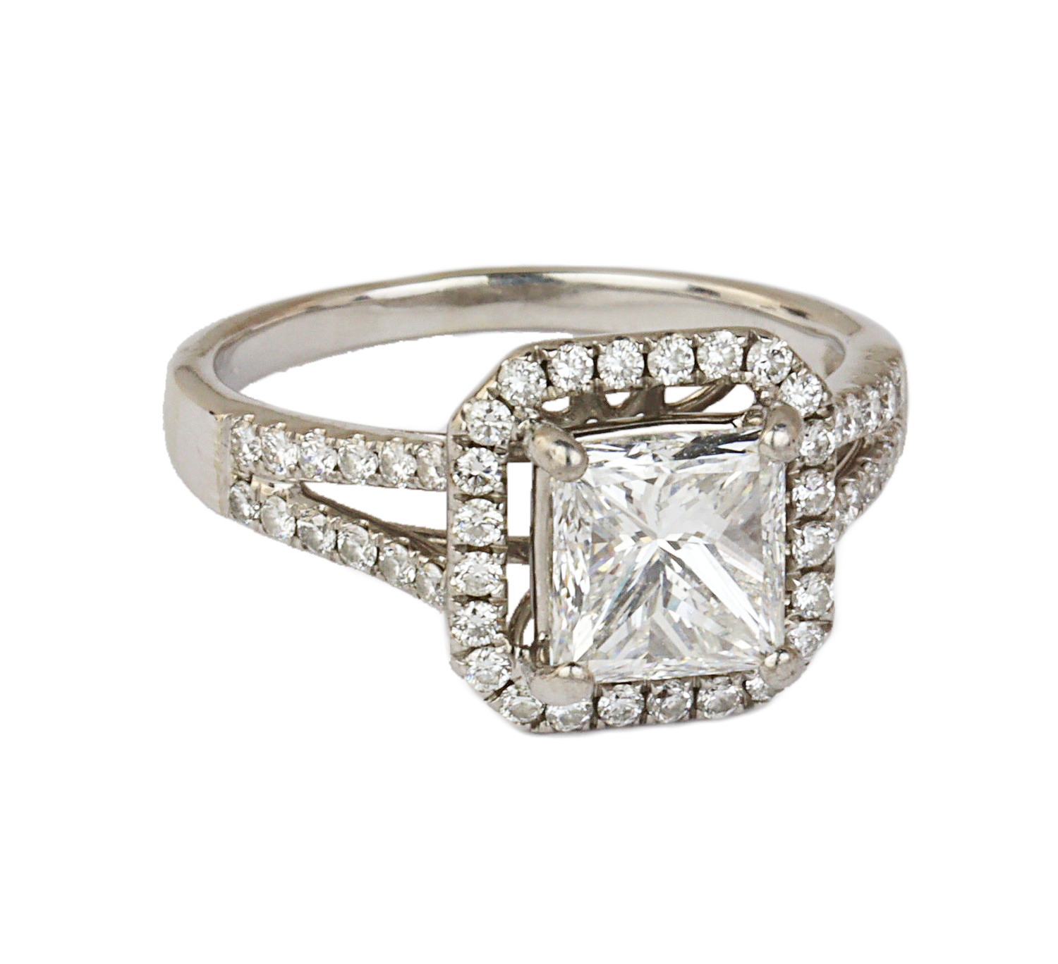 14k white gold engagement ring with a 2.02 carat square modified brilliant cut center diamond (VS1 clarity/E color), fits a size 7 finger, and weighs 4.18 grams. GIA cert # 13562601 is included in the sale.