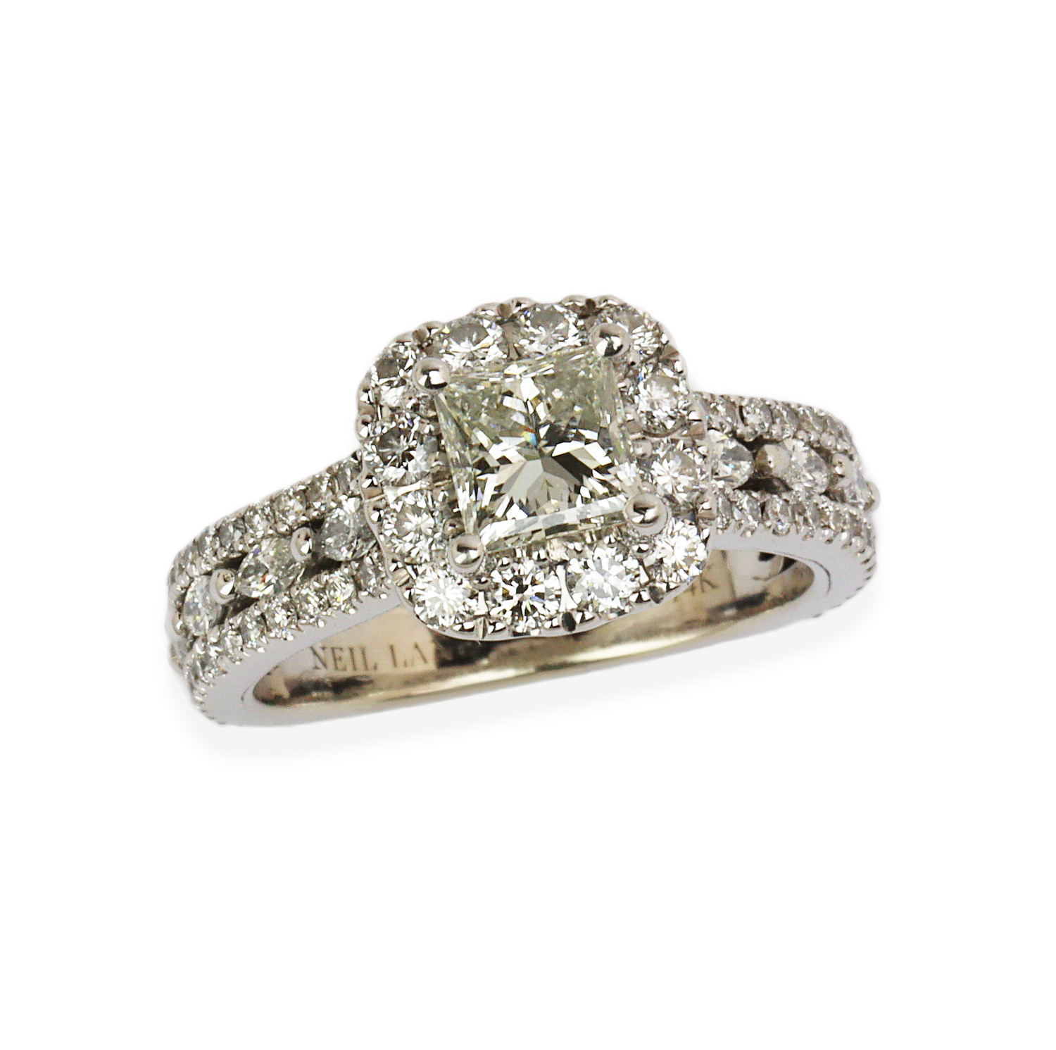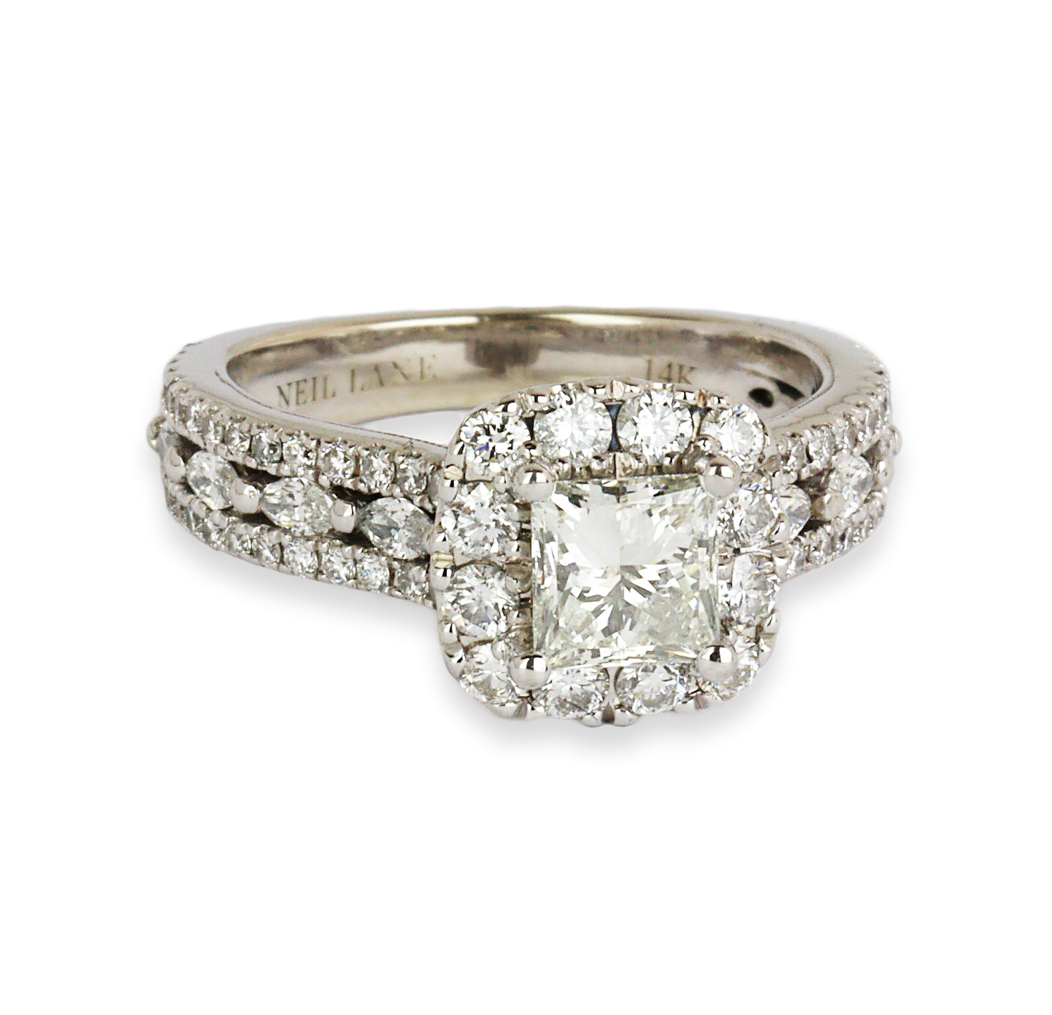 14k white gold ring with a 0.71 carat princess cut center diamond (VS2 clarity/ I color). The diamond accents amount to approximately 0.87 carat TW. Fits a size 4.75 finger, and weighs 5.04 grams. A copy of the GSI cert # 90747400110 is included in the sale.