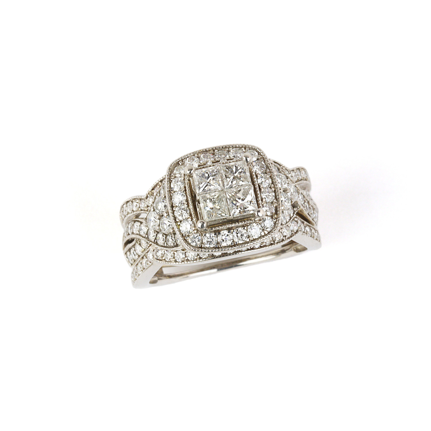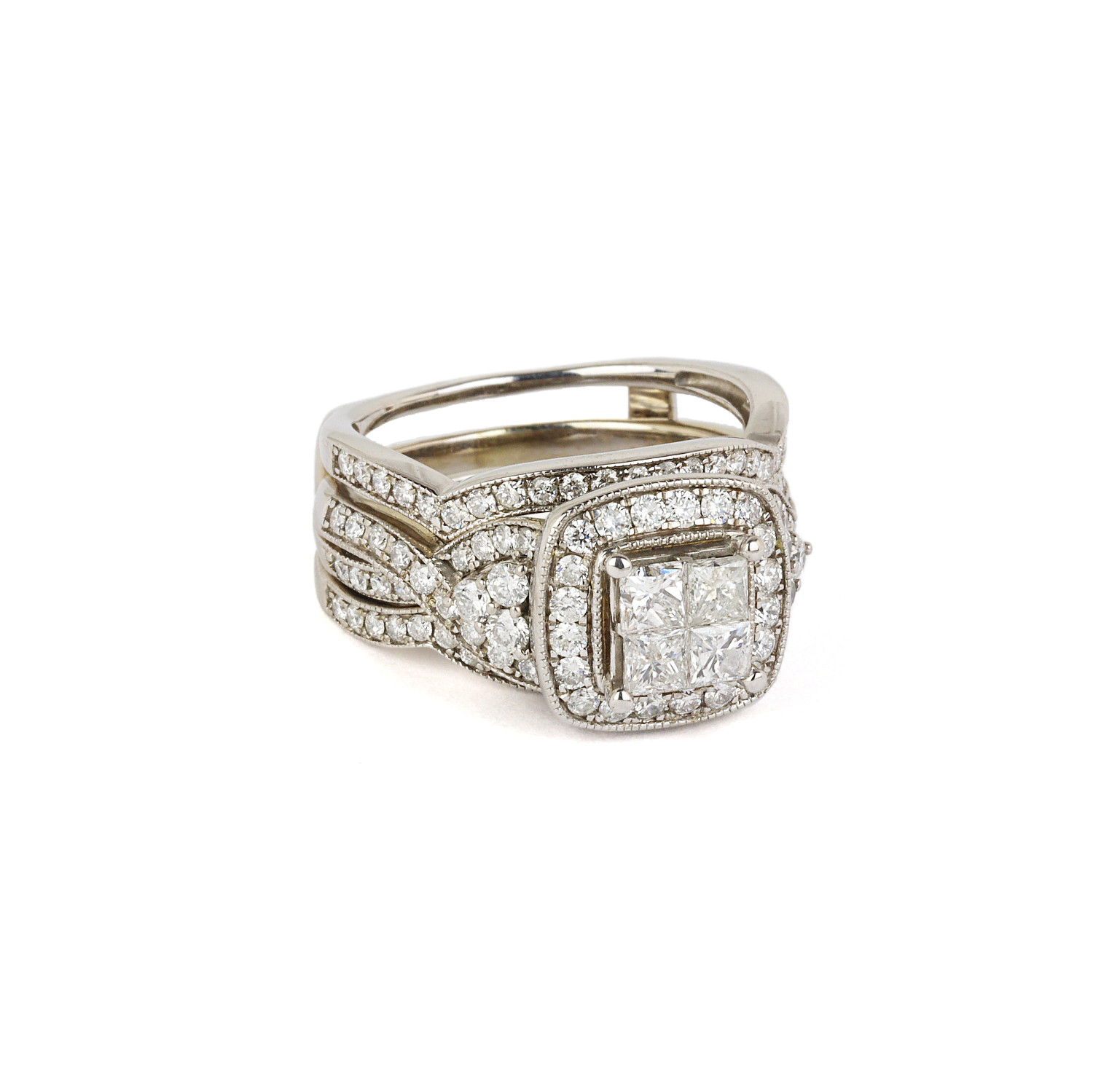 14k white gold wedding ring set with diamonds which amount to approximately 1.50 carat TW (SI1-I1 clarity/G-H-I color). Fits a size 7.25 finger, measures 12mm wide across the top, and weighs 10.5 grams.