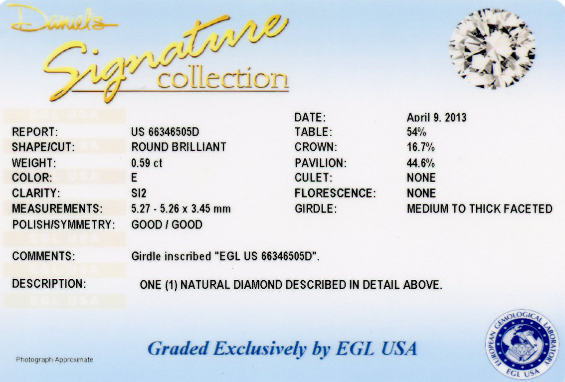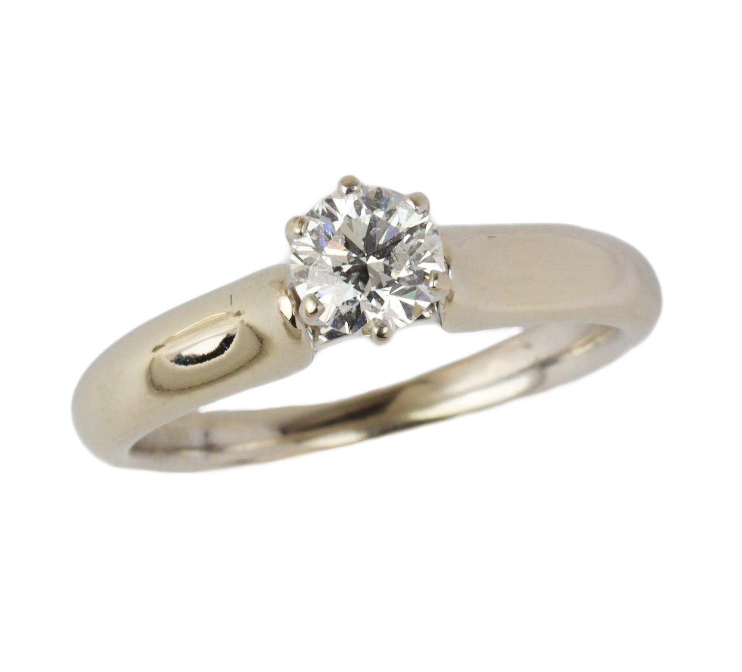 14k white gold ring with a 0.59 carat round brilliant cut diamond (SI2 clarity/E color). This ring fits a size 6.75 finger, measures 6mm wide across the top, and weighs 4.5 grams. EGL cert # 66346505D is included in the sale.