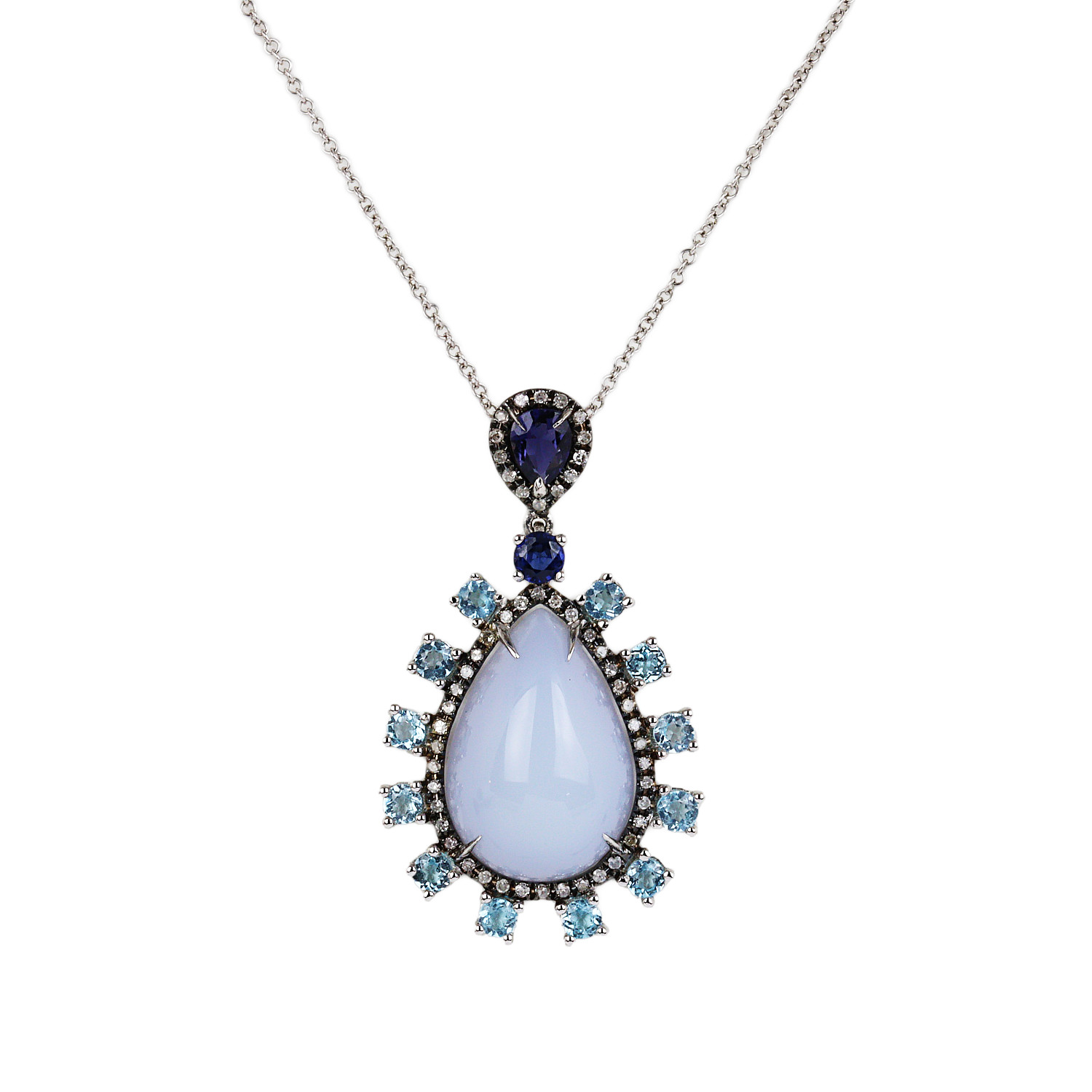 14k white gold necklace with a pendant containing a 17mm by 11mm chalcedony stone with sapphire, diamond, and tanzanite accents; the diamonds amount to 0.17 carat TW (I1 clarity/H-I-J color). The chain is 18″ long, the pendant measures 35mm tall, and total weight is 5.7 grams.