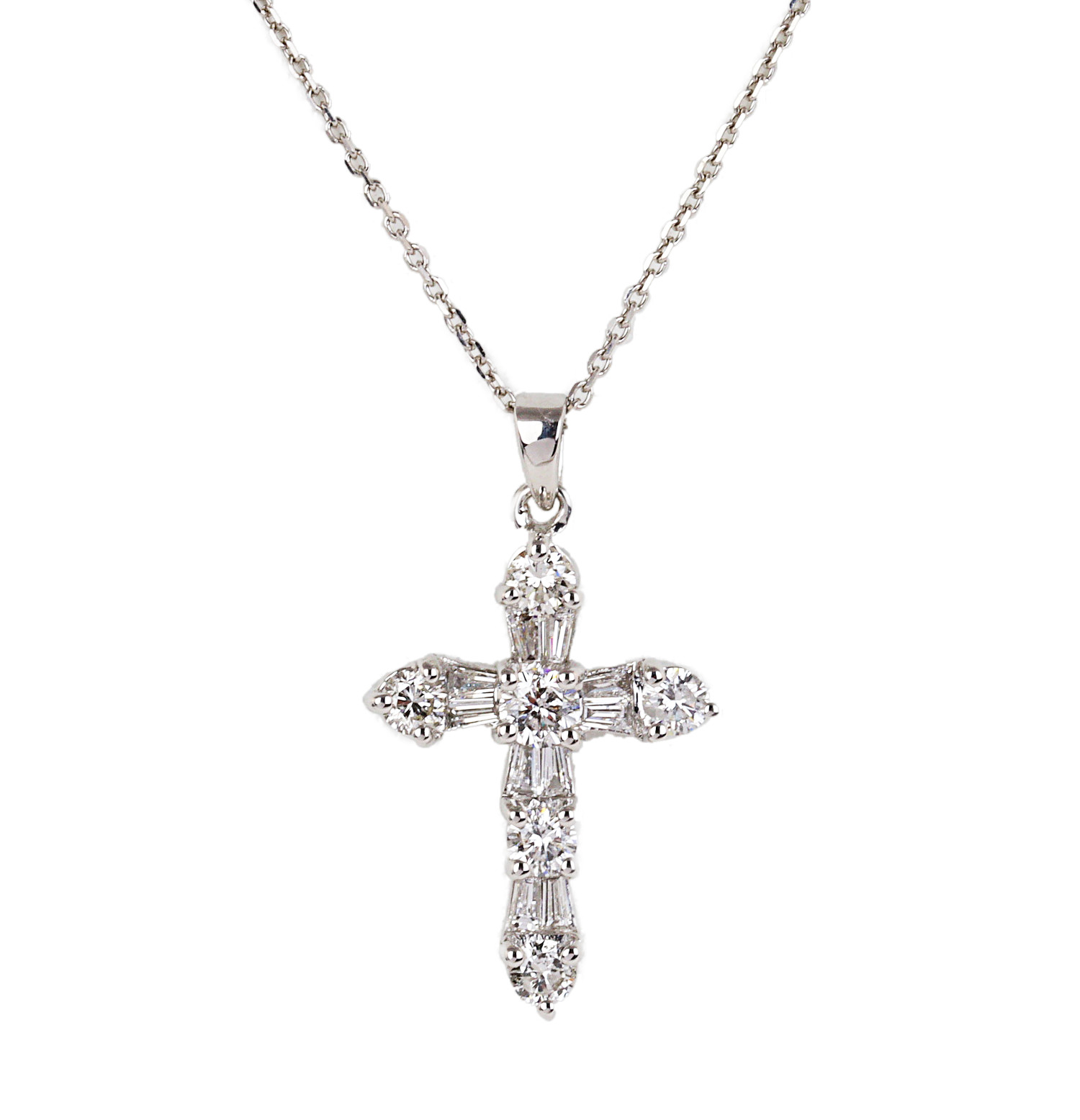 14k white gold necklace with a cross pendant containing round and baguette diamonds which amount to 1.00 TW (VS2-i1 clarity/G-H-I color). The chain is 18″ long (has an extender), the pendant measures 22mm by 16mm, and total weight is 3.6 grams.