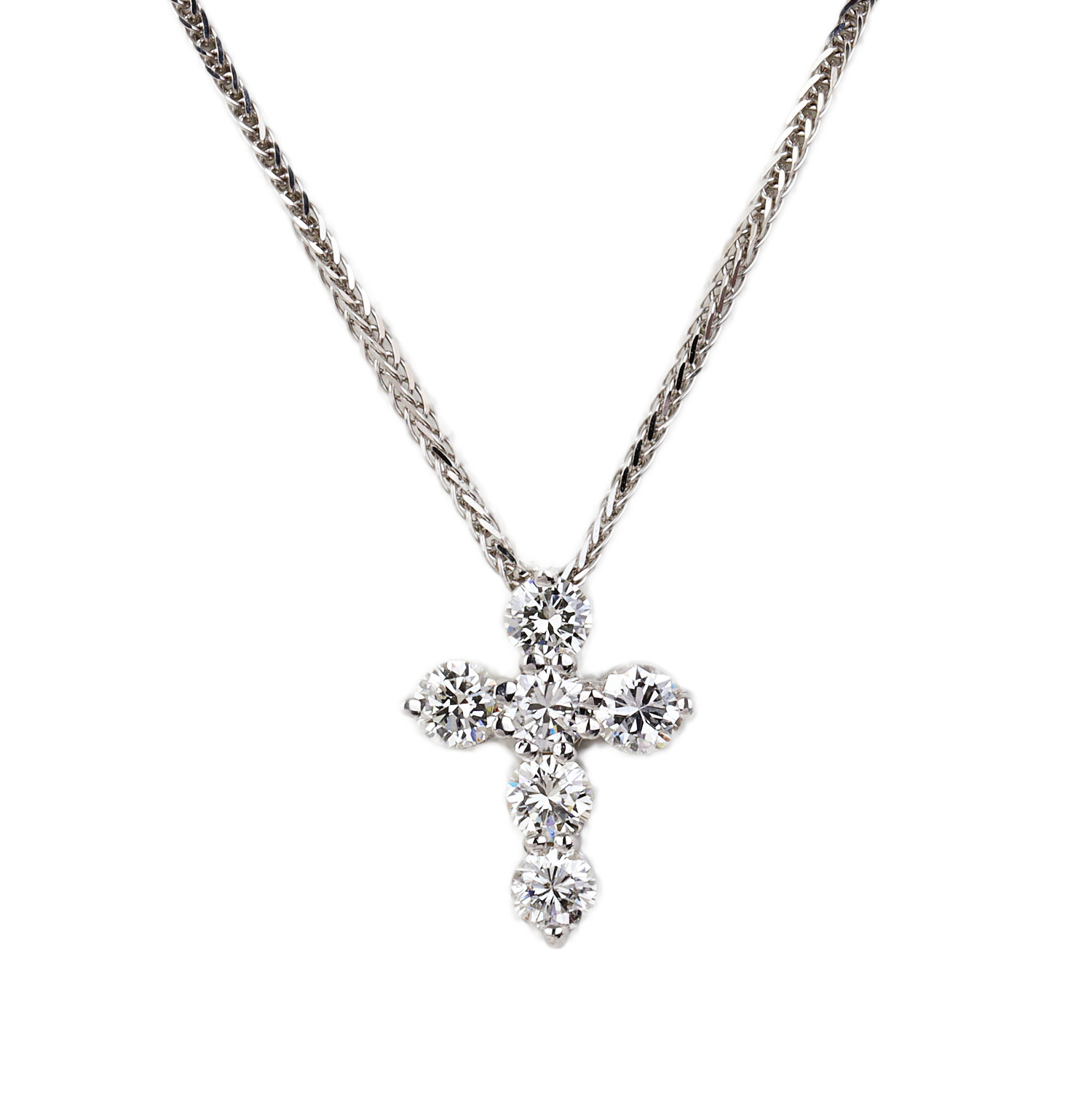 14k white gold necklace featuring a cross pendant containing diamonds which amount to 1.05 carat TW (SI1-SI2 clarity/G-H-I color). The pendant measures 15mm tall by 12mm wide, the chain is 20″ long, and total weight is 4.3 grams.