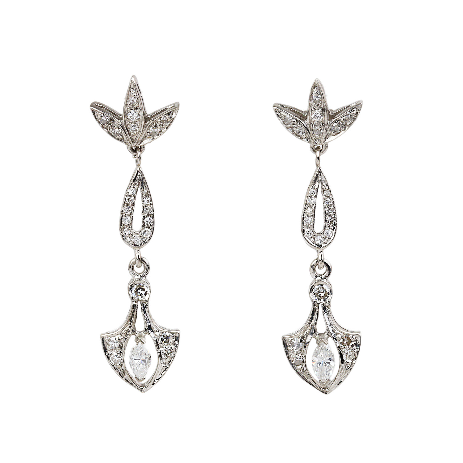 14k white gold earrings with diamonds which amount to approximately 1.20 carat TW (SI1-I1 clarity/F-G-H color). They measure 47mm tall, 12mm at the widest, and total weight is 6.4 grams.