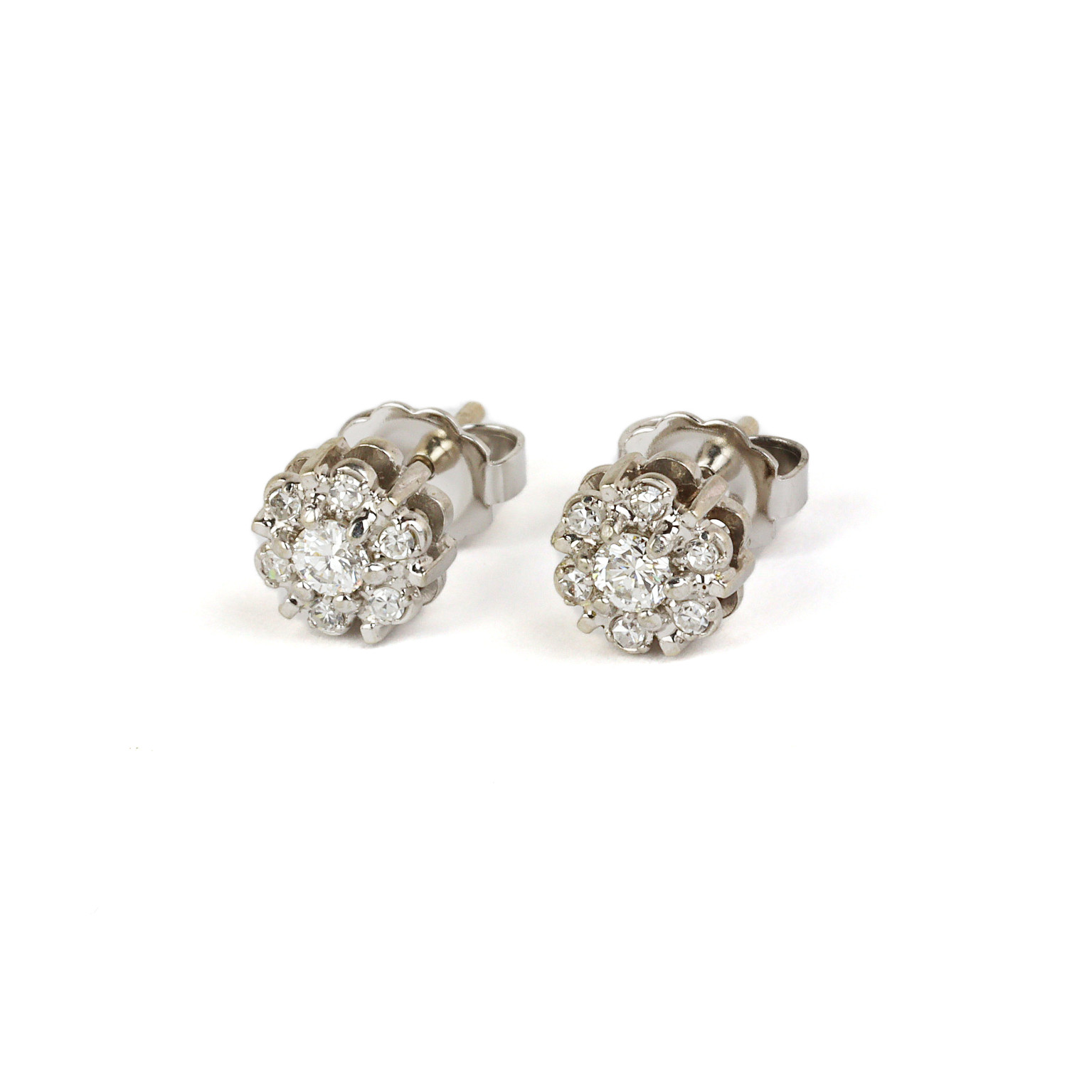 14k white gold flower stud earrings with diamonds which amount to approximately 0.20 carat TW (VS2-I1 clarity/G-H-I color). They measure 6.5mm in diameter and weigh 1.6 grams total.