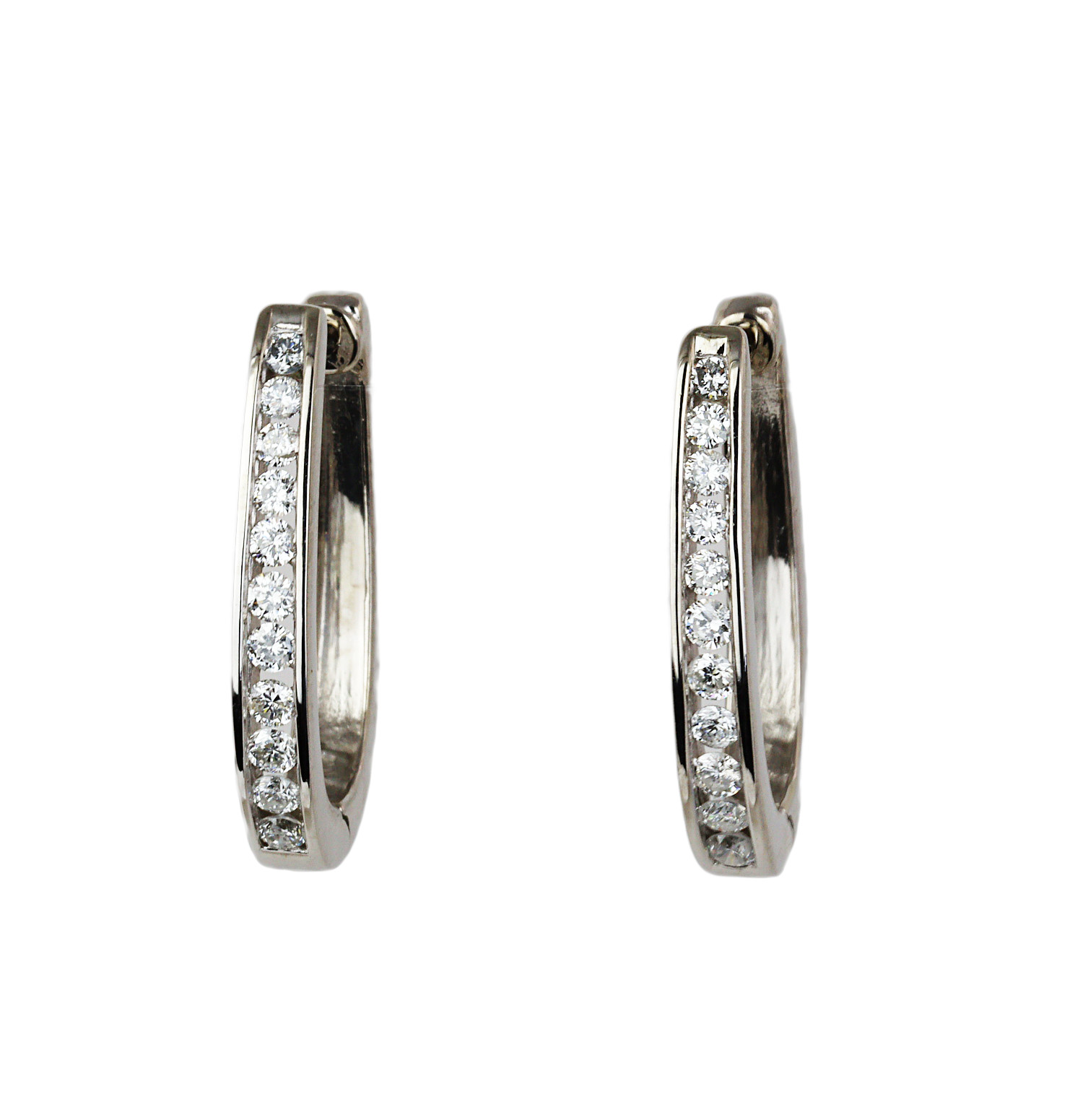 14k white gold oval hoop earrings with diamonds which amount to approximately 0.75 carat TW (I1-I2 clarity/G-H-I color). They measure 24mm tall, 17mm by 4mm wide, and total weight is 6.2 grams.
