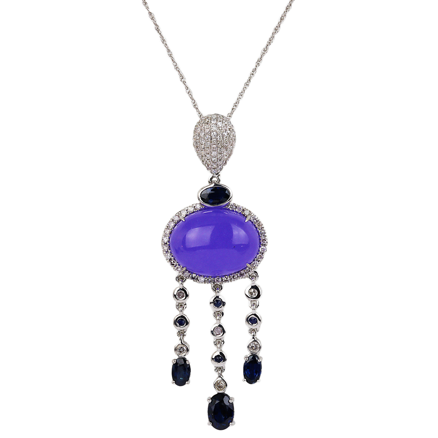 14k white gold necklace with a pendant containing a lavender jade stone with sapphire and diamond accents which amount to 0.45 carat TW (SI2-I1 clarity/G-H-I color). The chain is 18″ long, the pendant measures 51mm tall, and total weight is 5.9 grams.