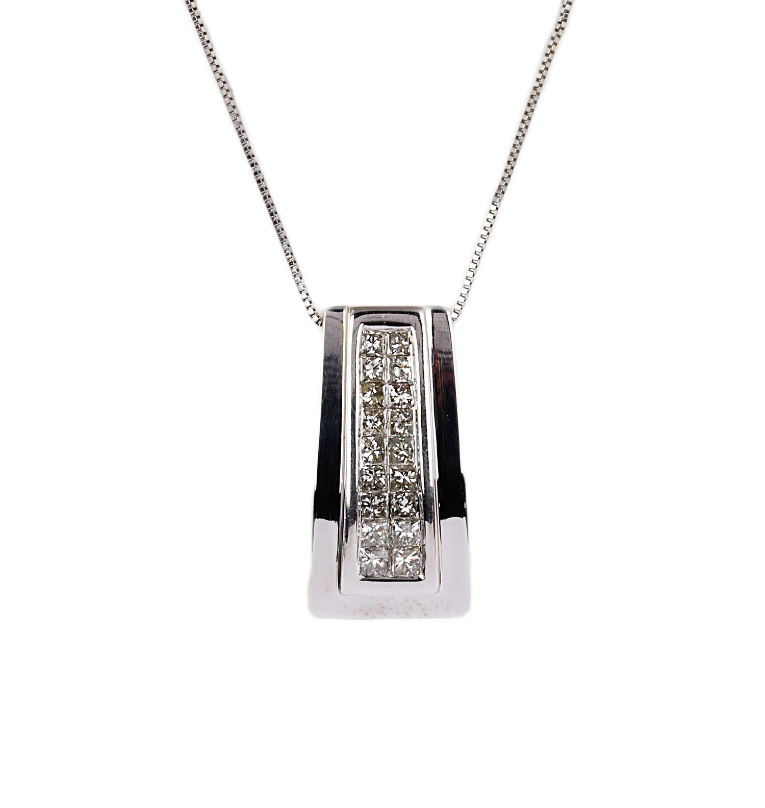 14k white gold necklace with a pendant containing round diamonds which amount to 0.40 carat TW (I1 clarity/G-H-I color). The chain is 18″ long, the pendant measures 19mm by 9mm and total weight is 4.7 grams.