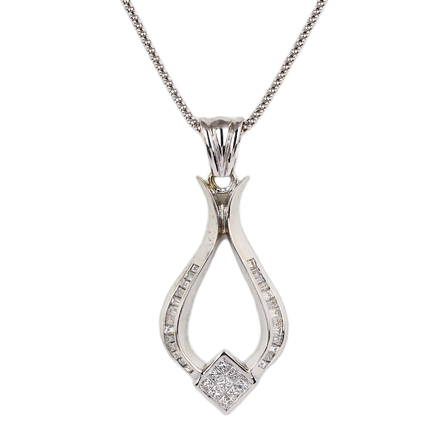 14k white gold necklace with a pendant containing diamonds which amount to 1.15 carat TW (VS2-SI2 clarity/G-H-I color). The chain is 18″ long, the pendant measures 47mm tall, and total weight is 10.3 grams.
