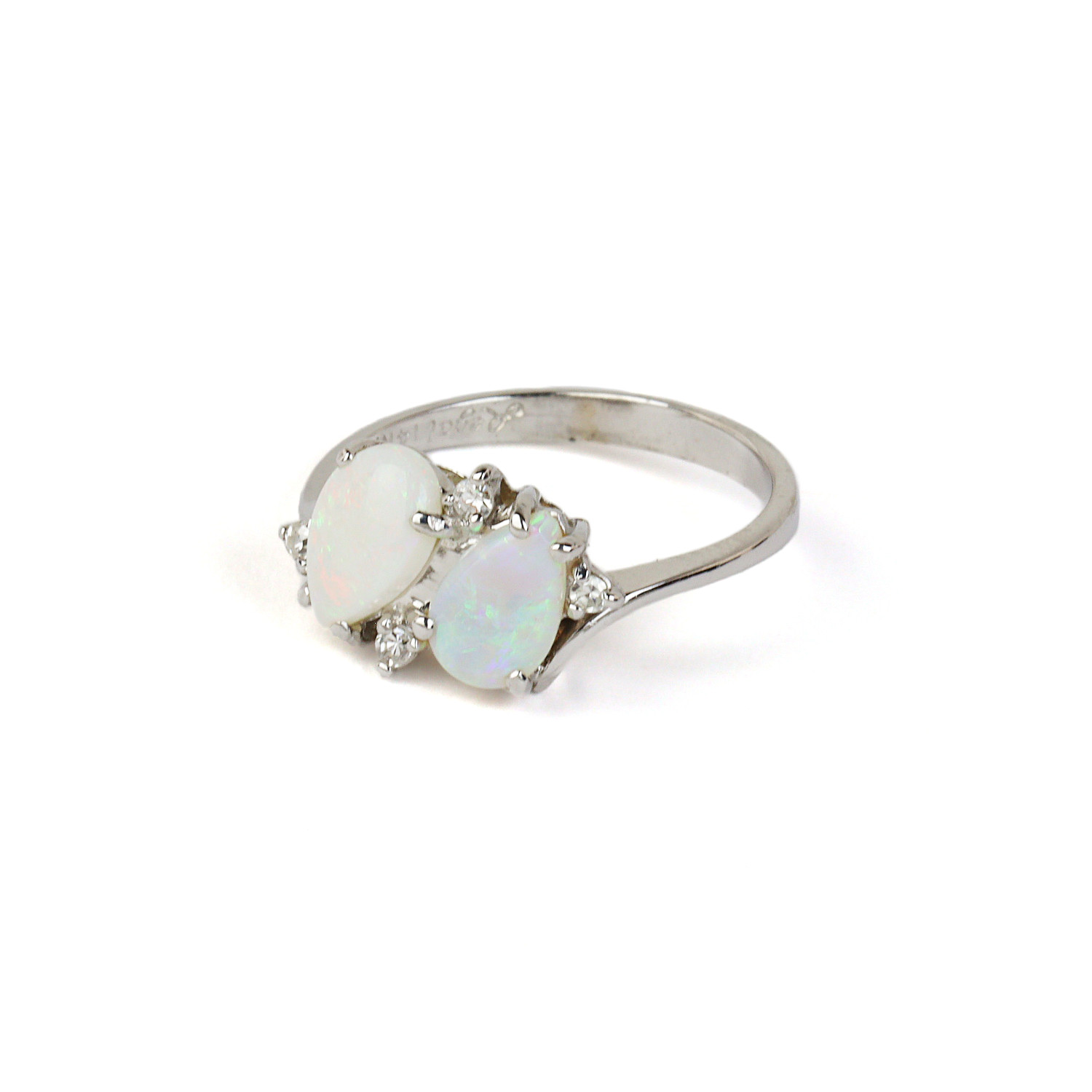 14k white gold ring with two 5mm by 8mm teardrop opal stones and diamond accents which amount to approximately 0.06 carat TW (VS2 clarity/G-H-I color). Fits a size 6.75 finger, measures 9mm wide across the top, and weighs 2.9 grams.