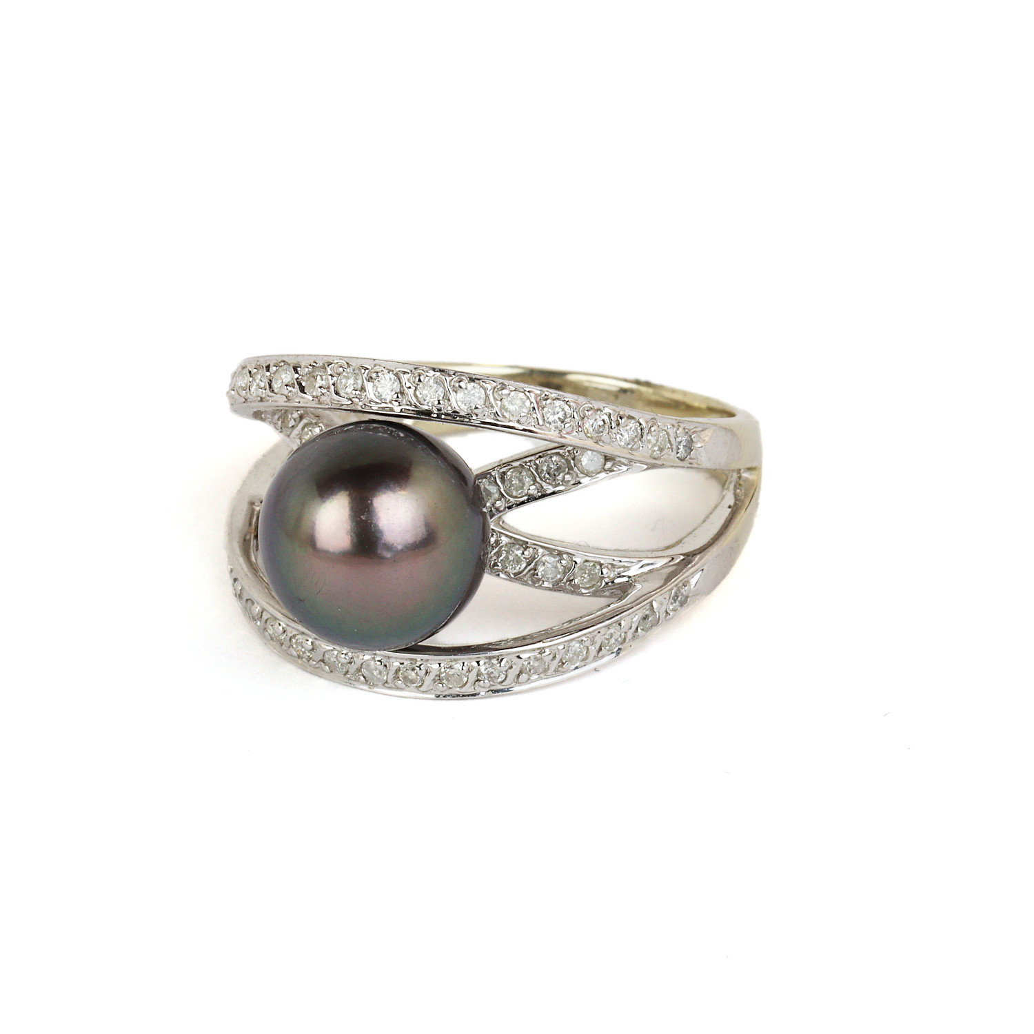 14k white gold ring with a 9mm in diameter black pearl and diamonds which amount to approximately 0.25 carat TW (I1-I0 clarity/H-I-J color). Fits a size 7.5 finger, measures 14mm wide across the top, and weighs 5.9 grams.