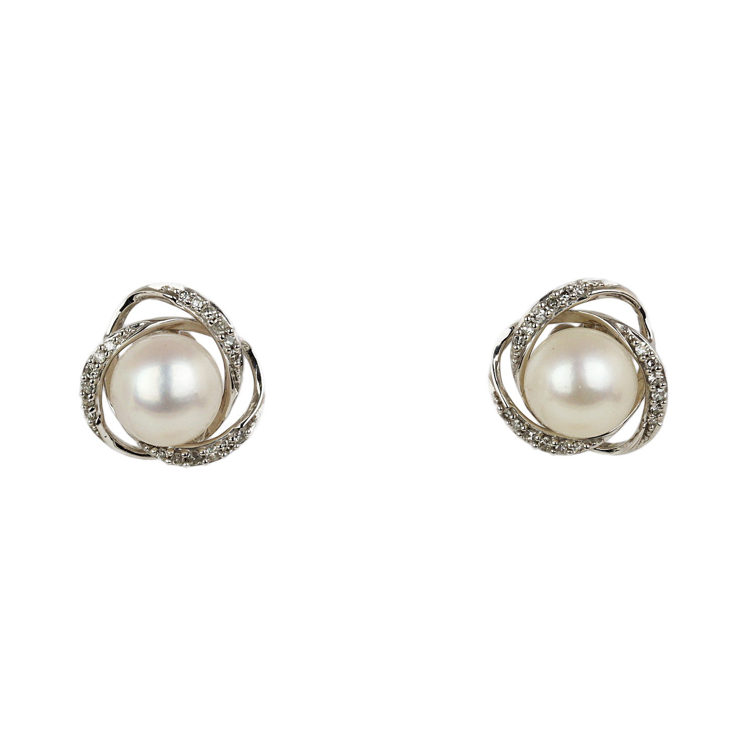 14k white gold stud earrings with pearls and diamonds which amount to approximately 0.15 carat TW (I1 clarity/H-I-J color). They measure 12mm in diameter and total weight is 3.1 grams.
