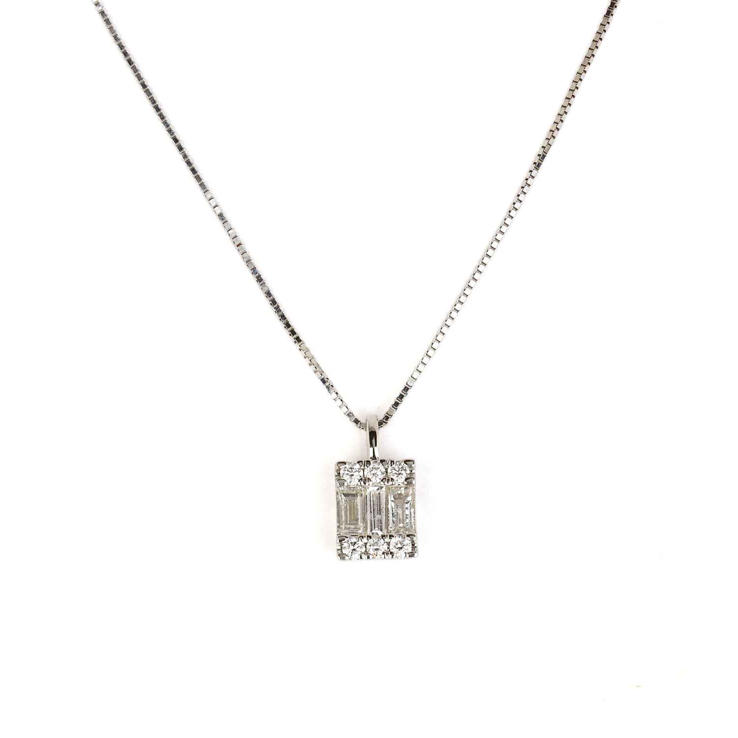 14k white gold necklace featuring a pendant containing round brilliant cut and baguette diamonds which amount to approximately 0.30 carat TW (SI1-I1 clarity/G-H-I color). The pendant measures 11mm tall, 6mm wide, the chain is 18″ long, and total weight is 1.5 grams.