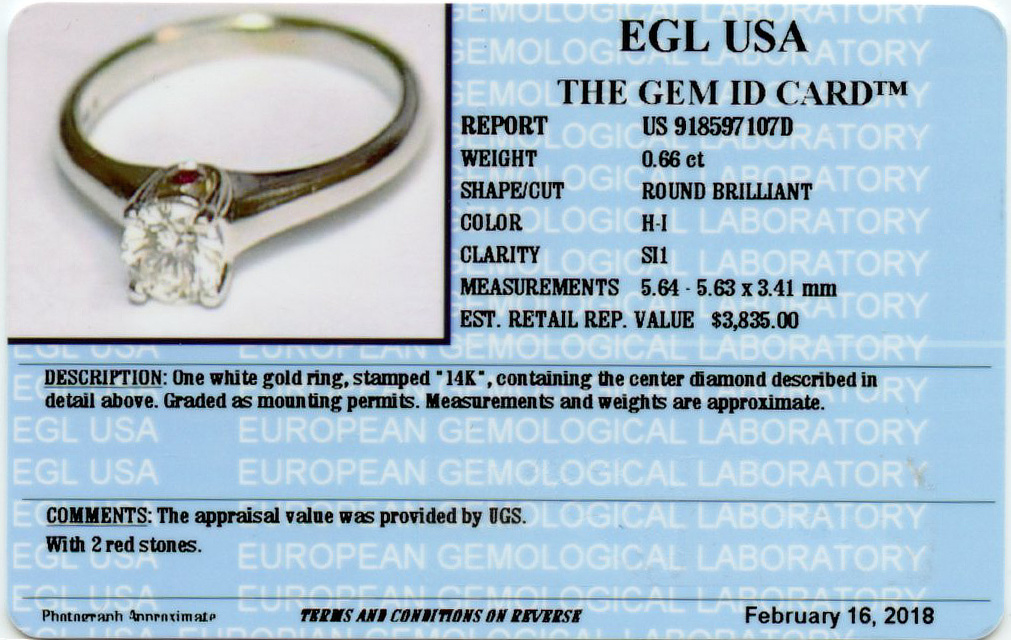 14k white gold ring with a 0.66 carat round brilliant cut diamond (SI1 clarity/H-I color) and 2mm round red accent stones. Measures 6mm wide across the top, fits a size 6.75 finger, and weighs 3.3 grams. EGL cert # 918597107D is included in the sale.