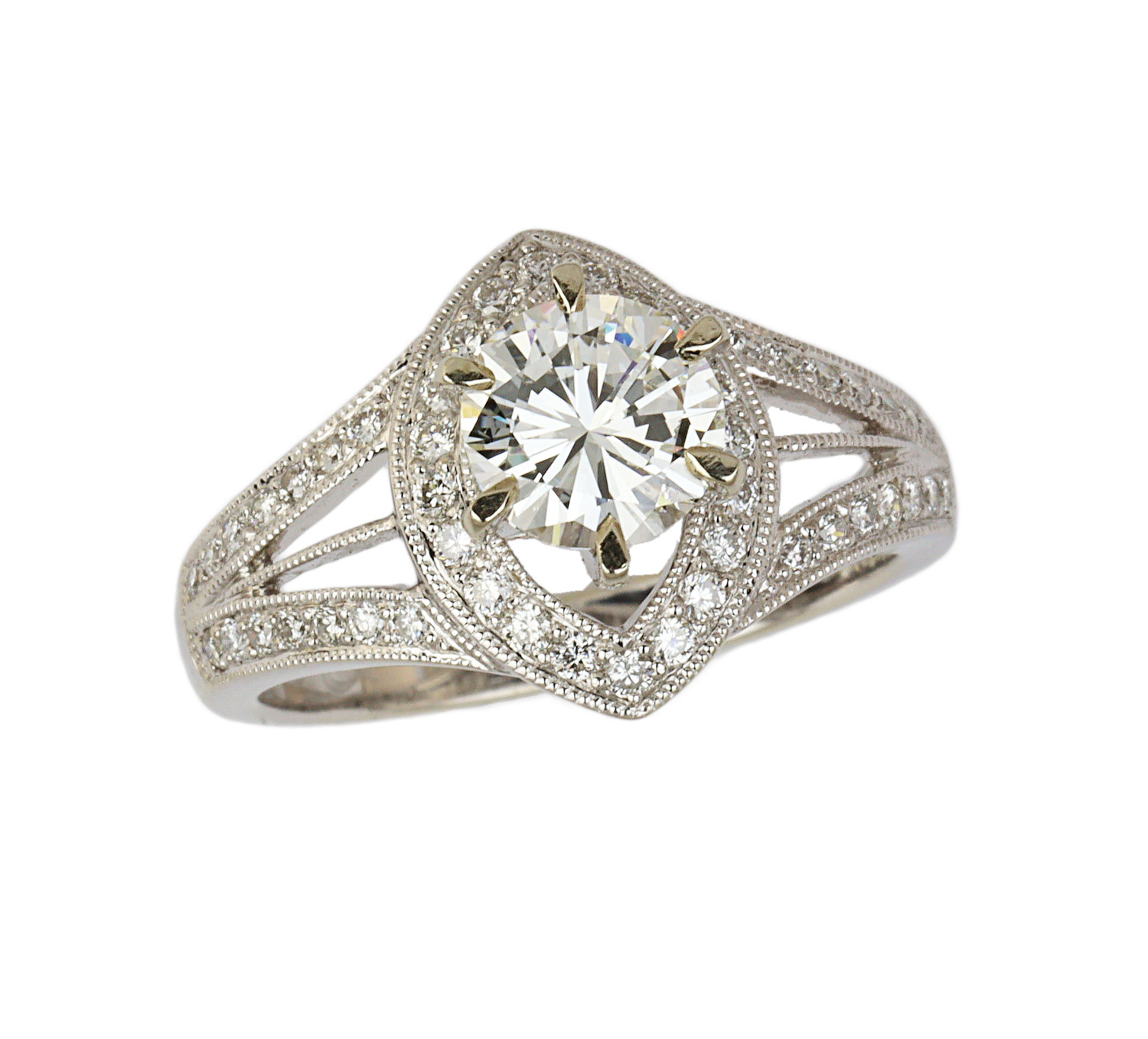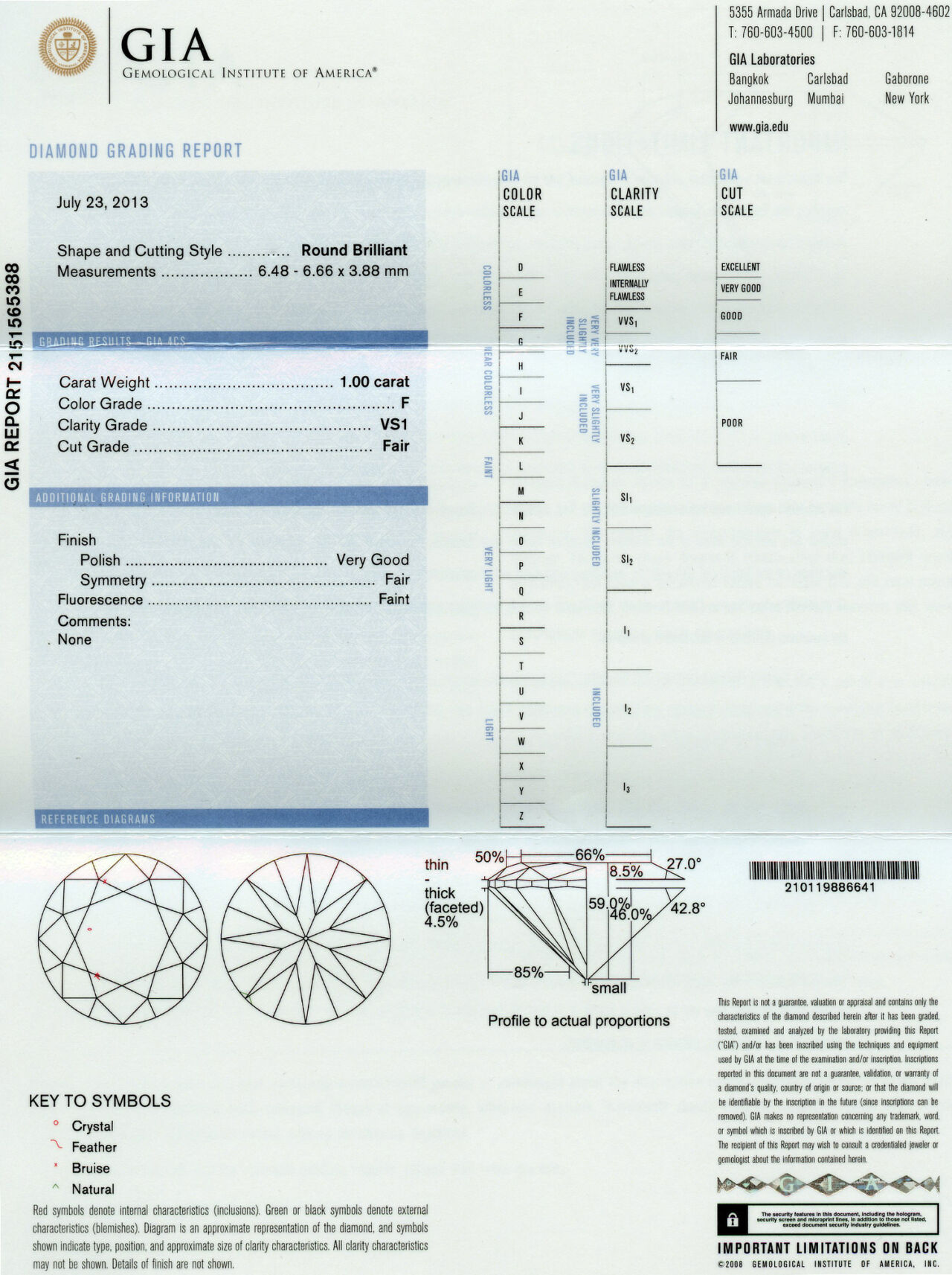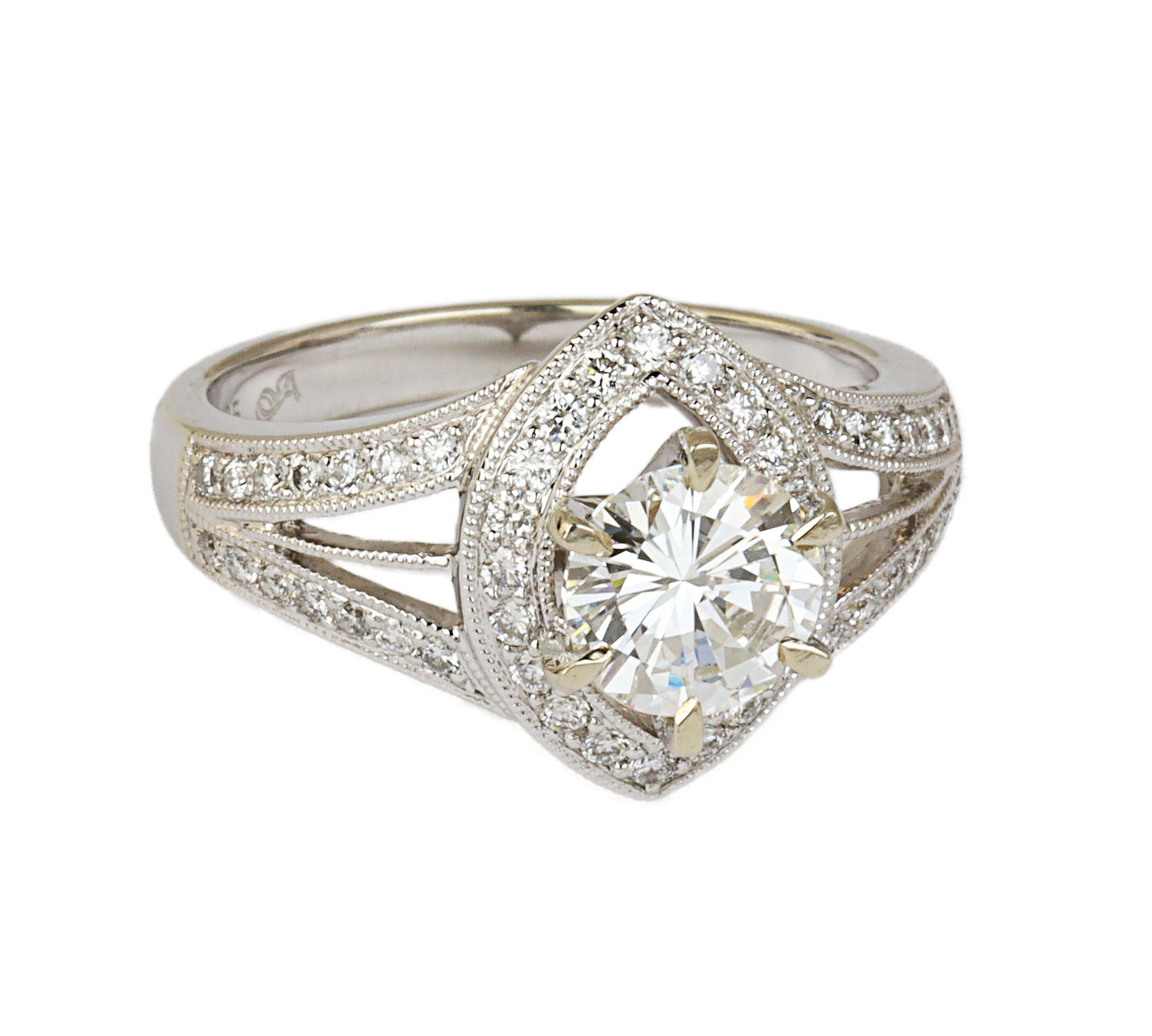 14K white gold ring with a 1.00 carat round brilliant cut center diamond (VS1 clarity/F color), fits a size 6 finger, and weighs 4.91 grams. GIA cert # 2151565388 is included in the sale.