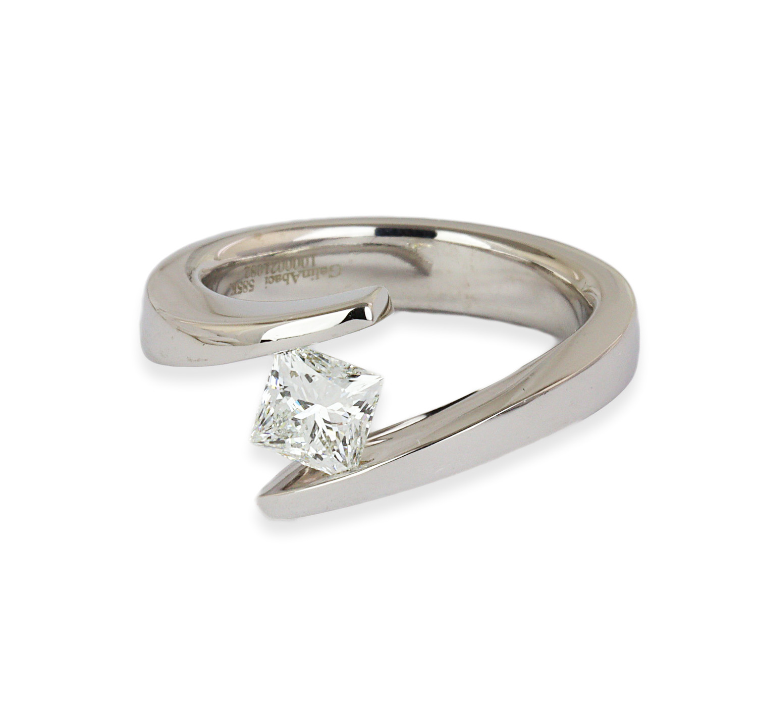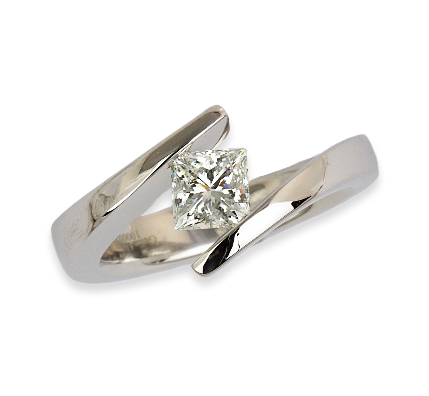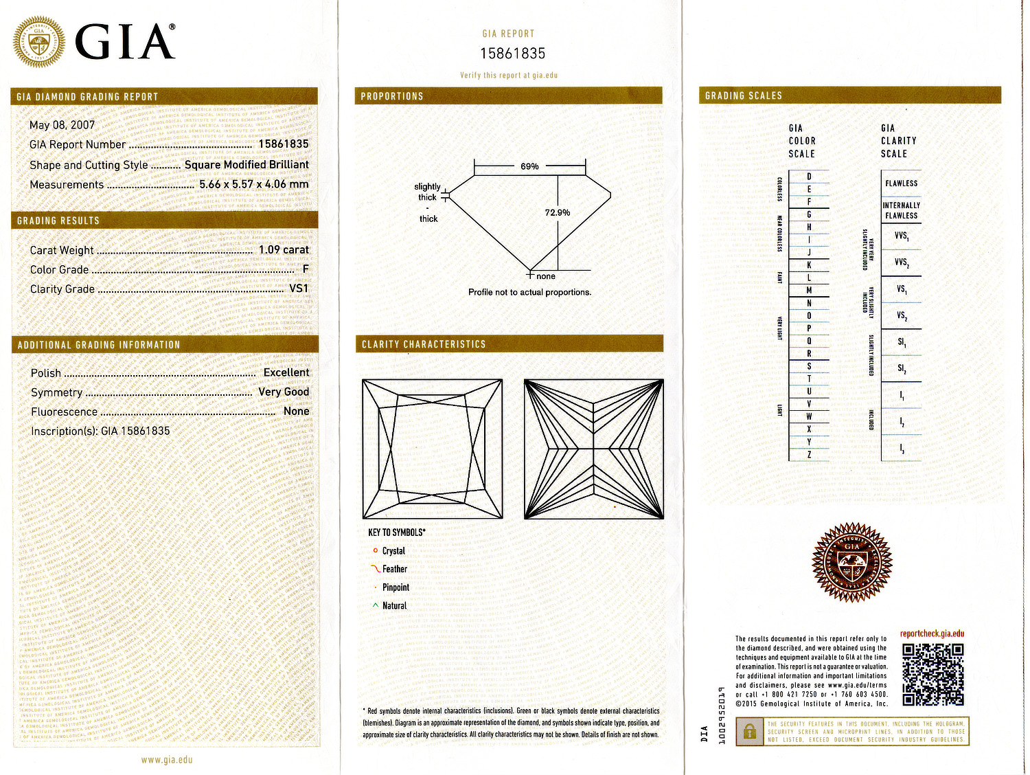 14k white gold ring with a certified 1.09 carat princess cut center diamond (VS1 clarity/F color). Fits a size 8.75 finger, measures 12mm wide across the top, and weighs 10.8 grams. GIA cert # 15861835 is included in the sale.