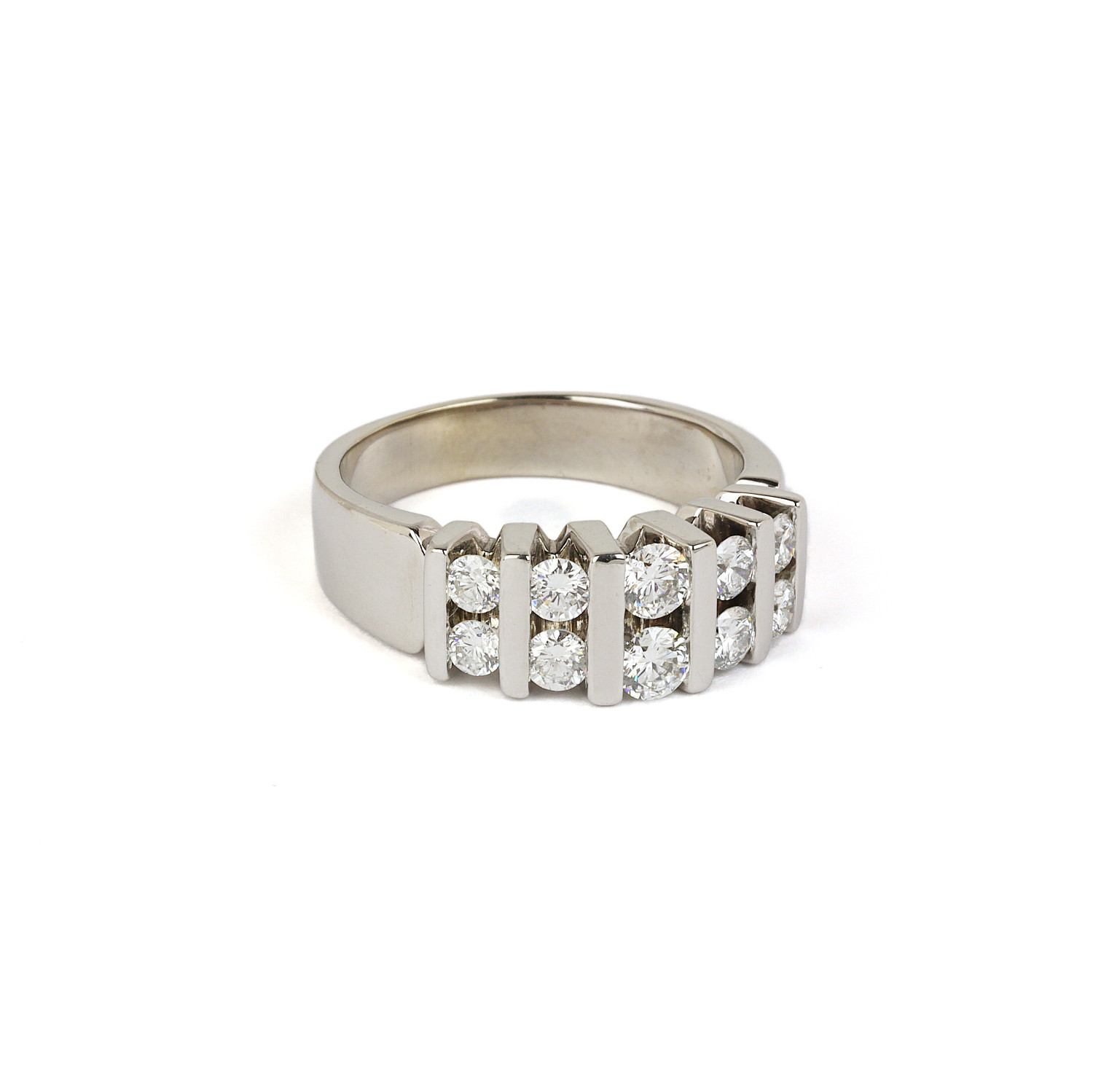14k white gold ring with diamonds which amount to approximately 1.50 carat TW (SI2-I1 clarity/G-H-I color). Fits a size 7.75 finger, measures 8mm wide across the top, and weighs 9.1 grams.