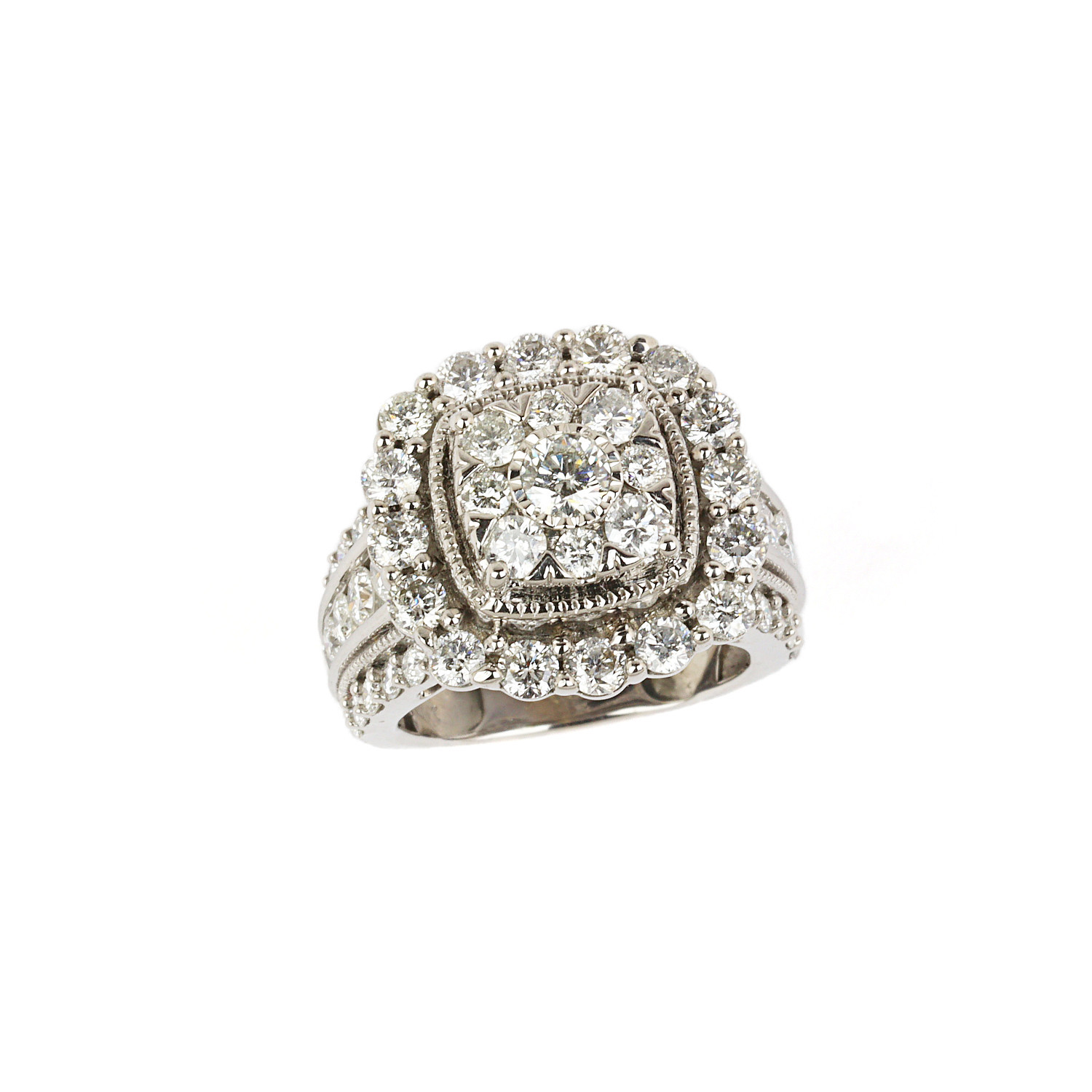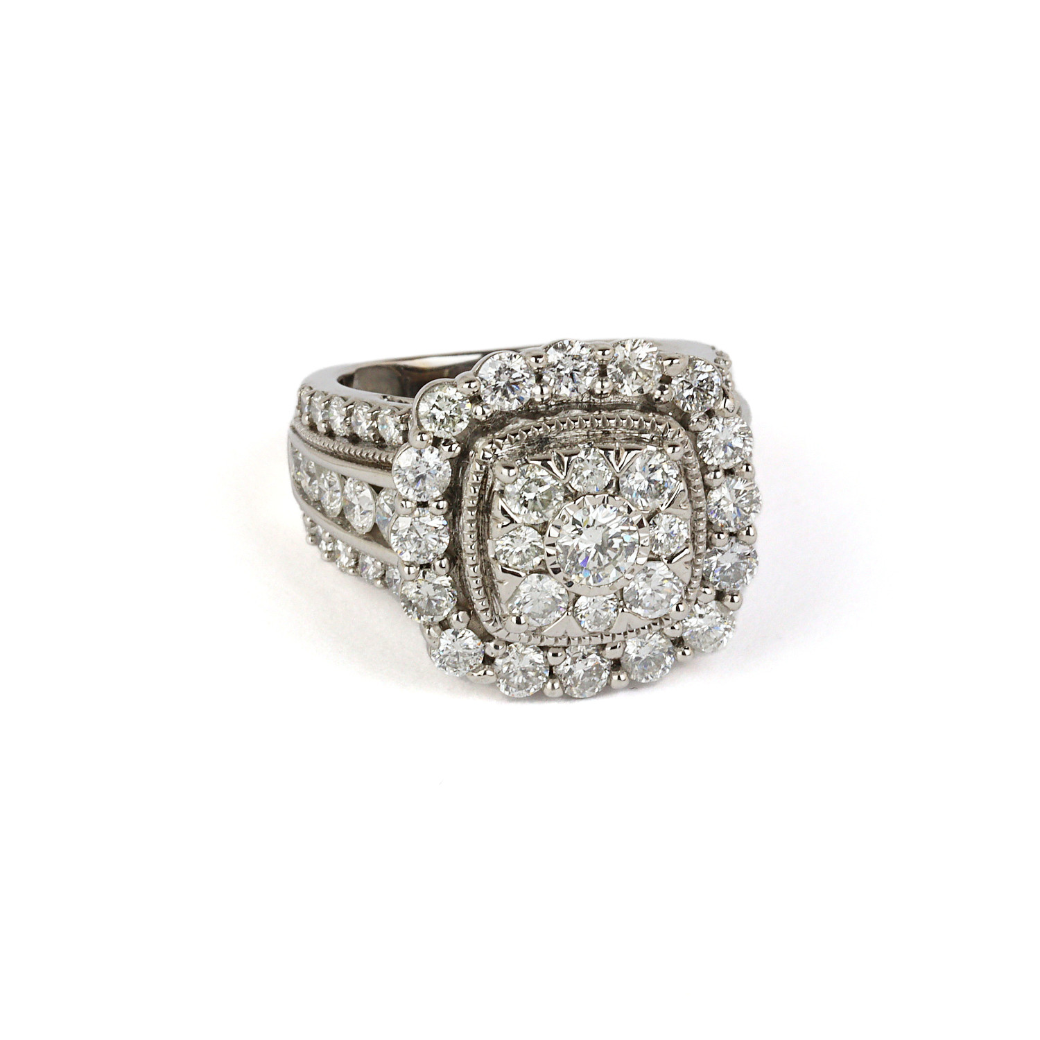 14k white gold ring with diamonds which amount to approximately 2.50 carat TW (I1 clarity/G-H-I color). Fits a size 5 finger, measures 17mm wide across the top, and weighs 9.3 grams.