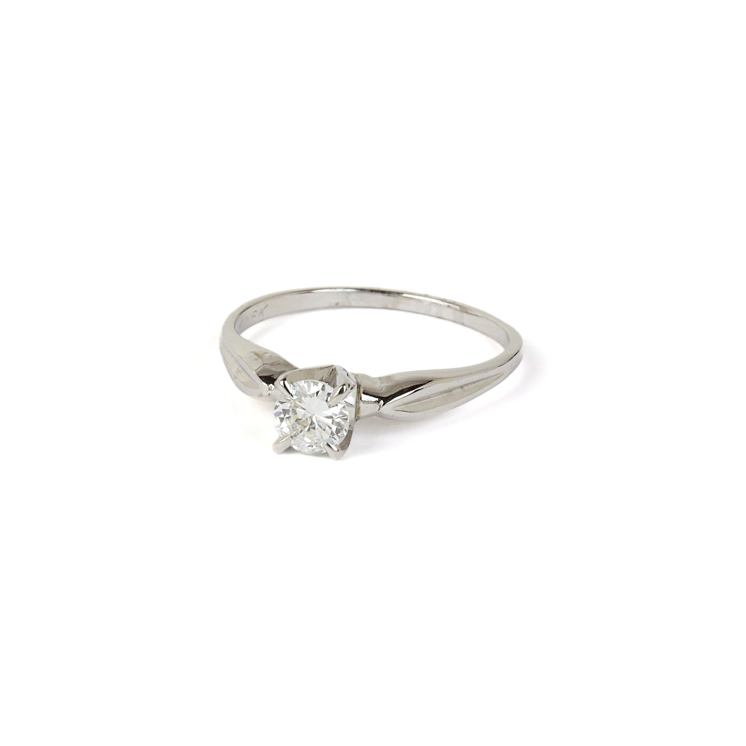 14k white gold ring with diamonds which amount to approximately 0.48 carat TW (VS1 clarity/H-I-J color). Fits a size 8.5 finger, measures 5mm wide across the top, and weighs 2.7 grams.