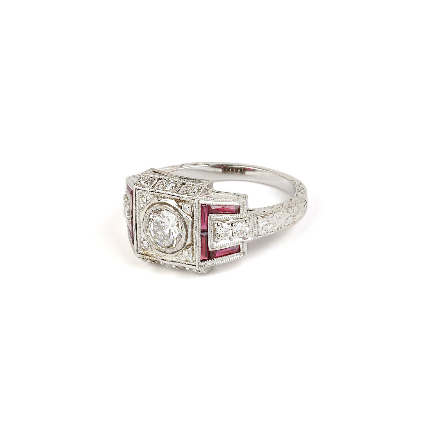 JC Blackburn 14k white gold ring featuring a 0.54 carat round brilliant cut center stone (VS2 clarity/F color), with smaller diamond and ruby accents. Fits a size 6.75 finger, measures 10.5mm wide across the top, and weighs 3.7 grams. EGL cert # US912299322D.
