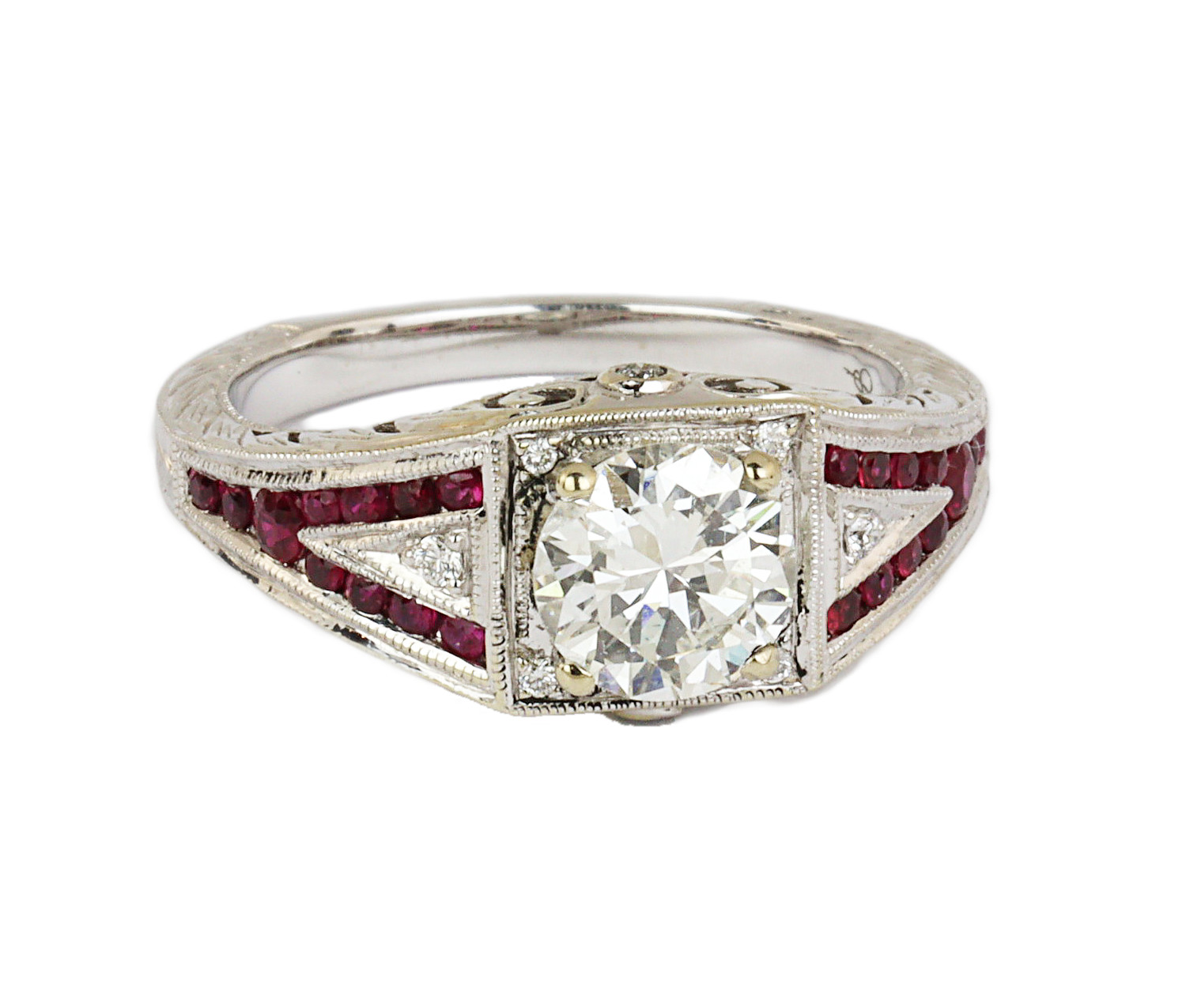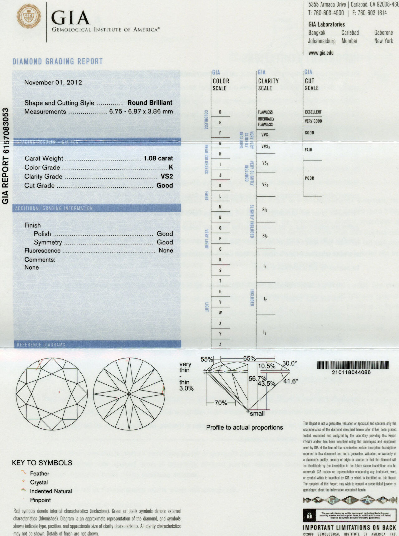 14K white gold ring with a 1.08 carat round brilliant cut center diamond (VS2 clarity/K color), fits a size 6.5 finger, and weighs 5.15 grams. GIA cert # 6157083053 is included in the sale.