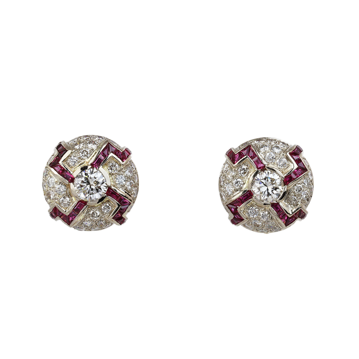 14k white gold omega back earrings with ruby stones, 1.44 carat TW center diamonds (I1 clarity/J-K-L color), and 1.92 carat TW accent diamonds. Making the total carat weight approximately 3.36. They measure 17mm in diameter and total weight is 13.2 grams.